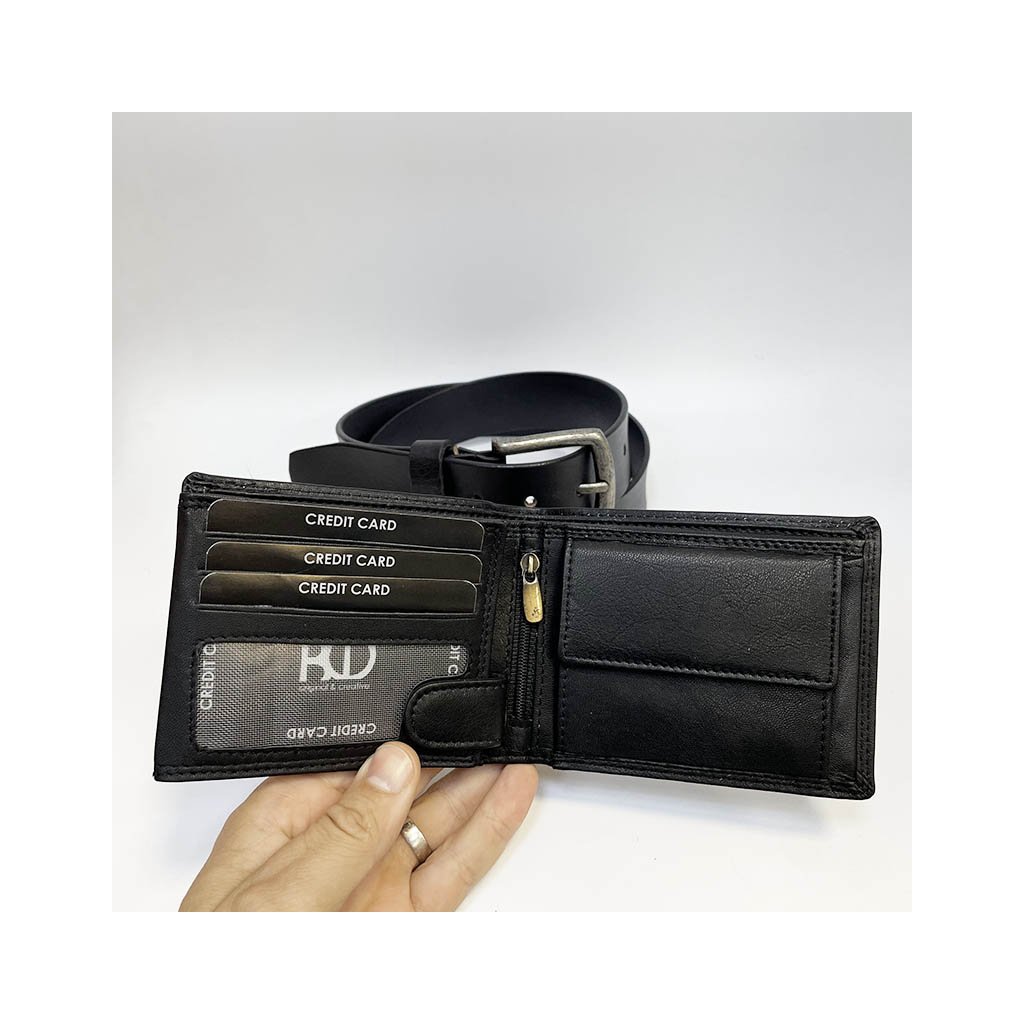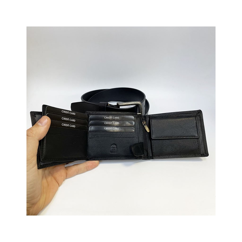 Pánský kožený set BE ORIGINAL v černém provedení je ideální volbou pro muže, kteří si potrpí na kvalitu, styl a detail. Obsahuje dvě základní součásti mužského outfitu – koženou peněženku a kožený pásek ve stejném designu.