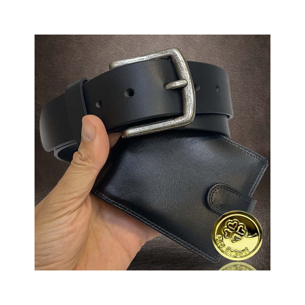 Pánský kožený set černý EXCLUSIVE RFID ROYAL Leather kožená peněženka a kožený pásek s monogramem (ražba) + Akce - zlatá mince Pro štěstí ZDARMA
