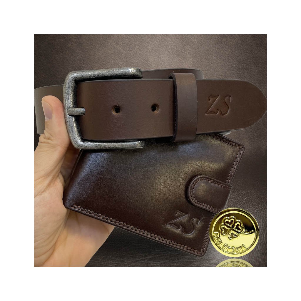 Elegantní hnědý kožený set z jemné kůže NAPPA. Obsahuje peněženku bez zapínání a pásek s možností ražby monogramu. Luxusní komplet v dárkovém balení.