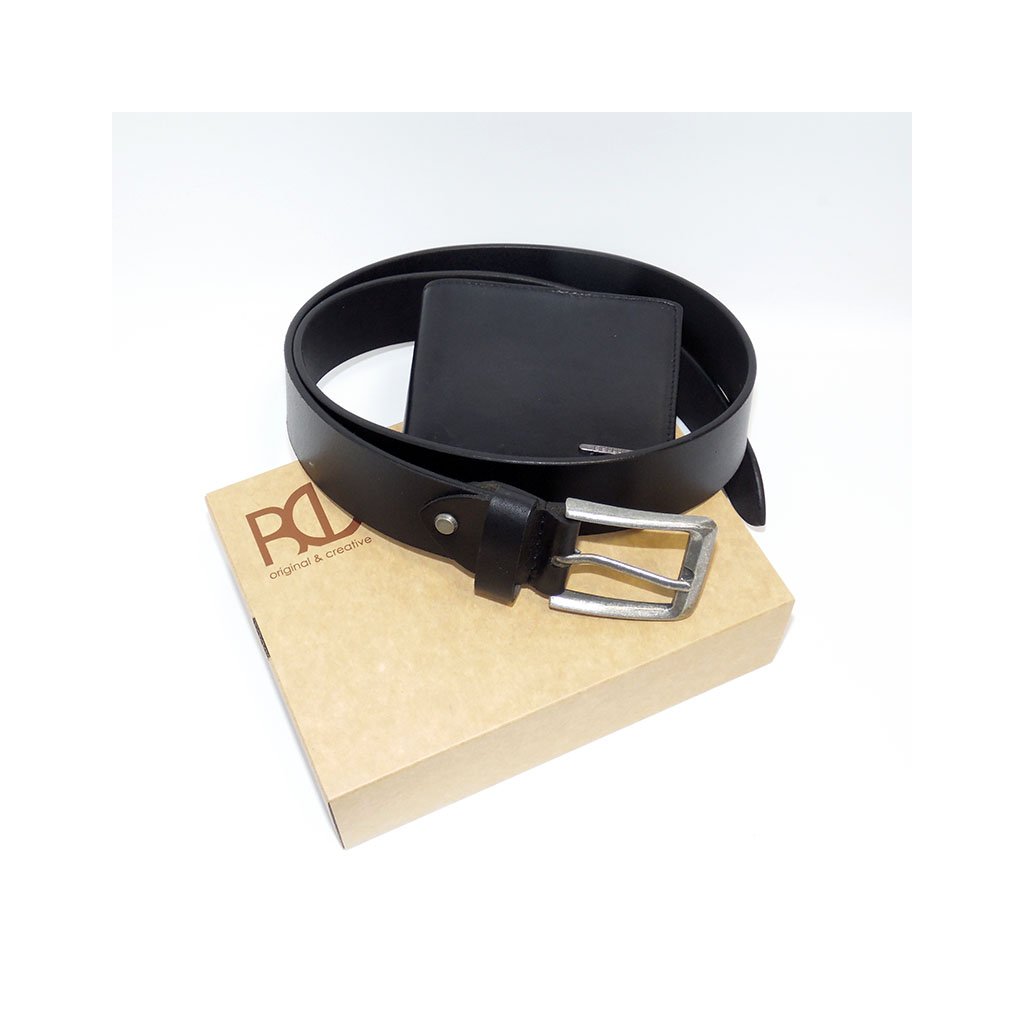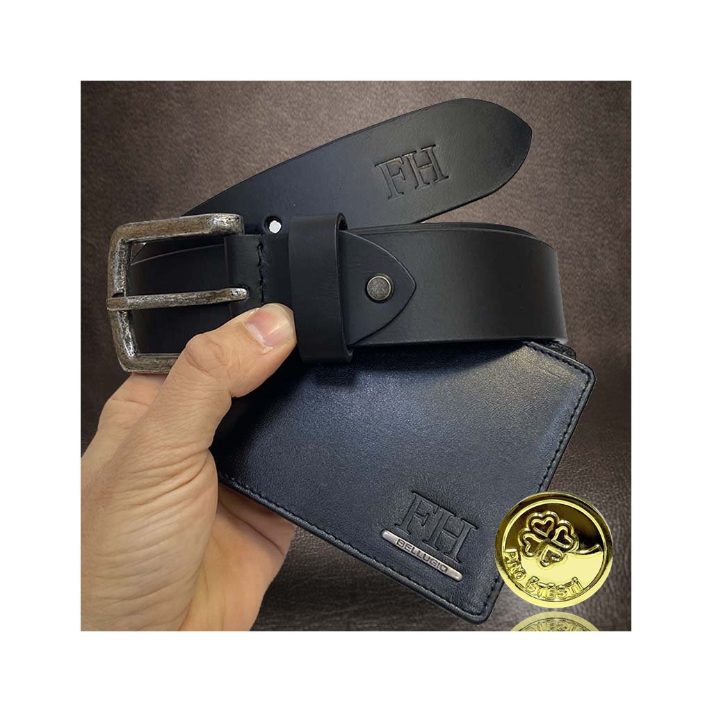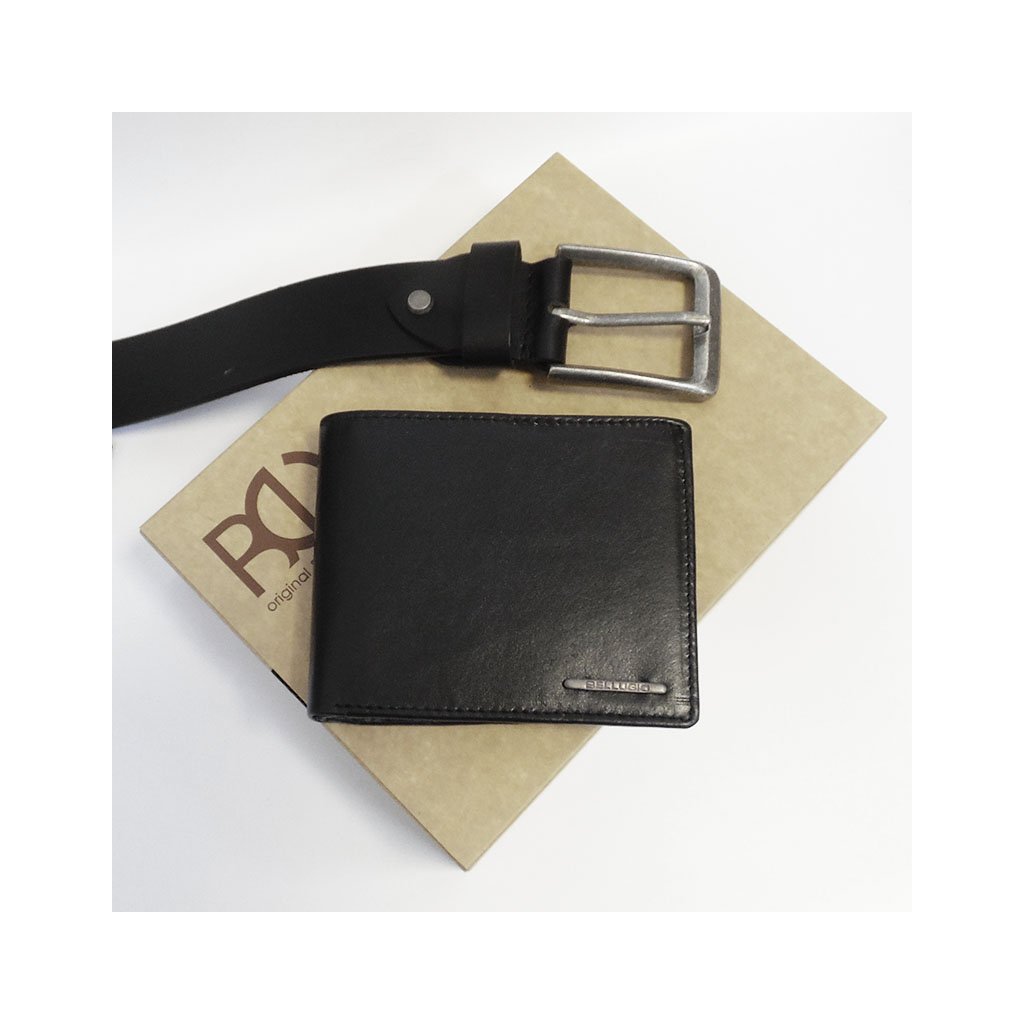 Pánský kožený set RFID BELLUGIO Leather černý kožená peněženka a kožený pásek s monogramem (ražba) + Akce - zlatá mince Pro štěstí ZDARMA