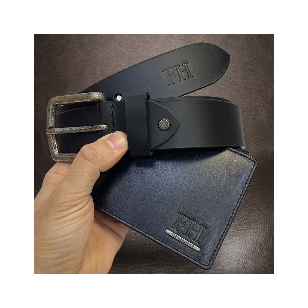- Kožený černý pásek – decentní, elegantní, s kovovou sponou a možností ražby monogramu