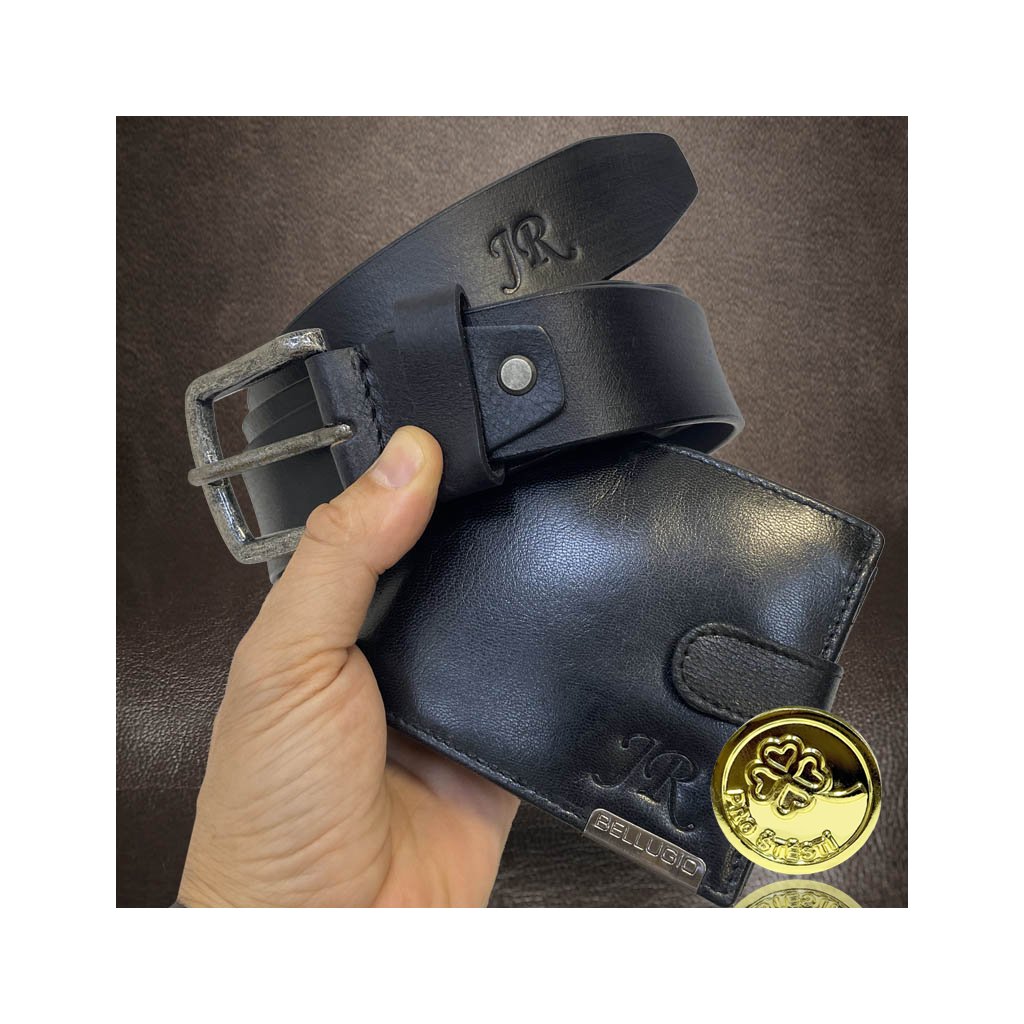 Pánský kožený set RFID Bellugio Leather černý kožená peněženka a kožený pásek s monogramem (ražba) + Akce - zlatá mince Pro štěstí ZDARMA
