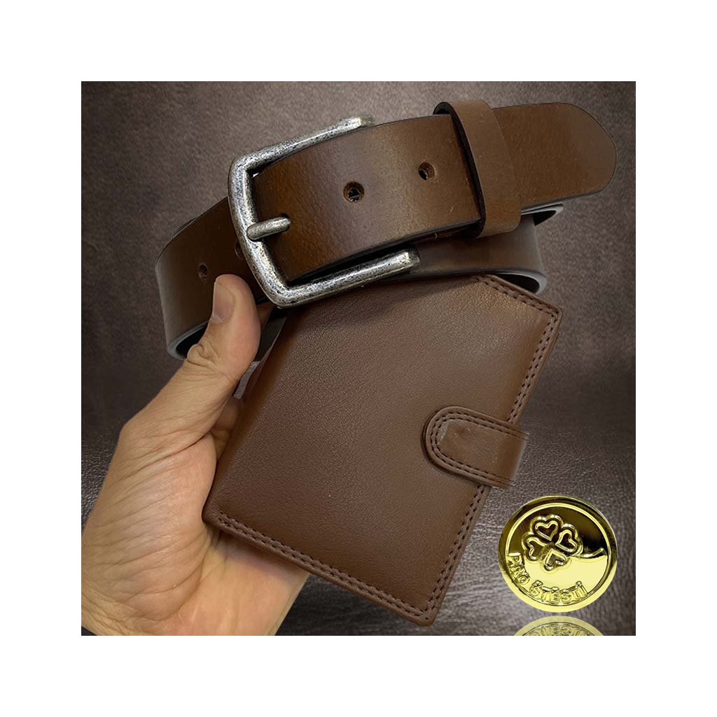 Elegantní hnědý kožený set z jemné kůže NAPPA. Obsahuje peněženku bez zapínání a pásek s možností ražby monogramu. Luxusní komplet v dárkovém balení.