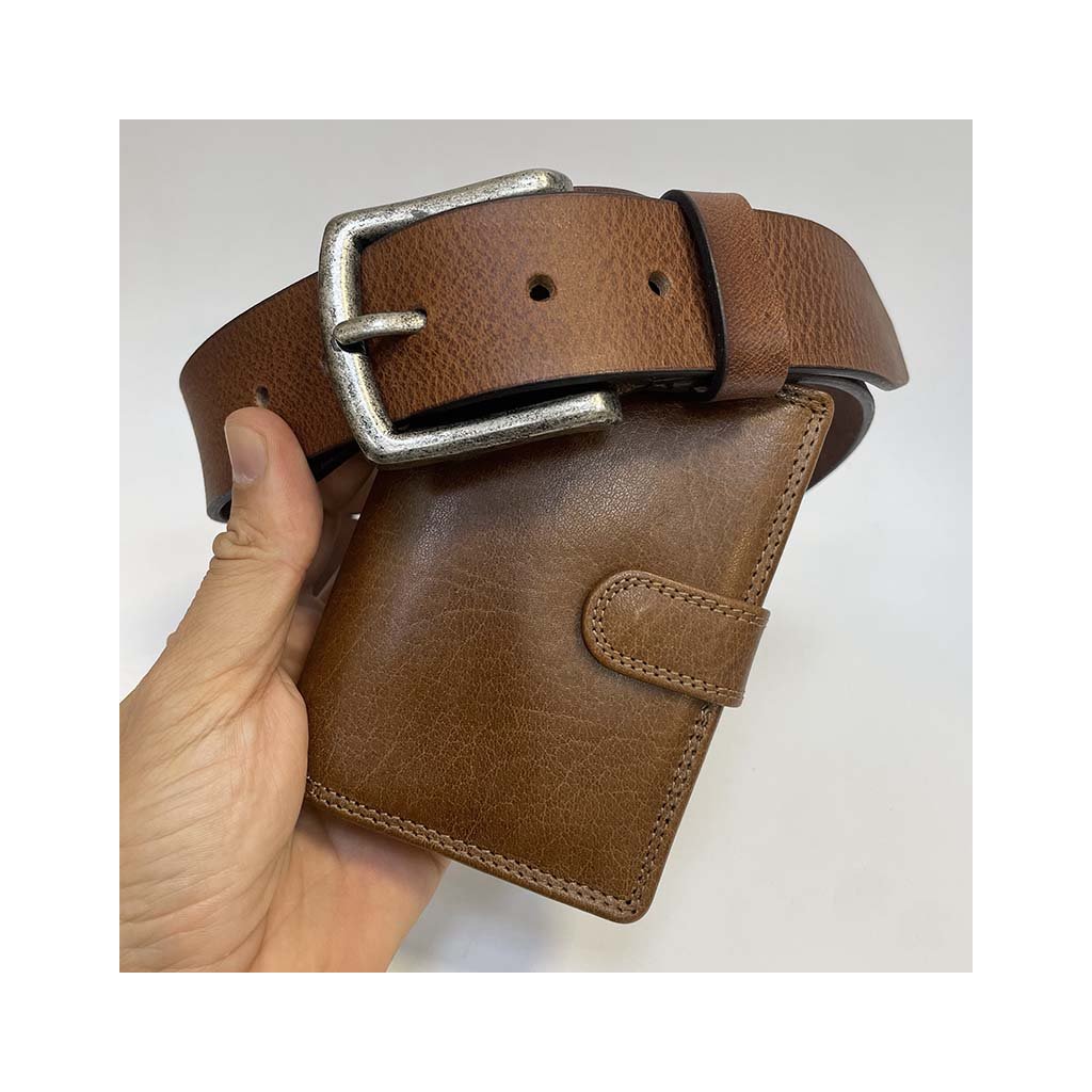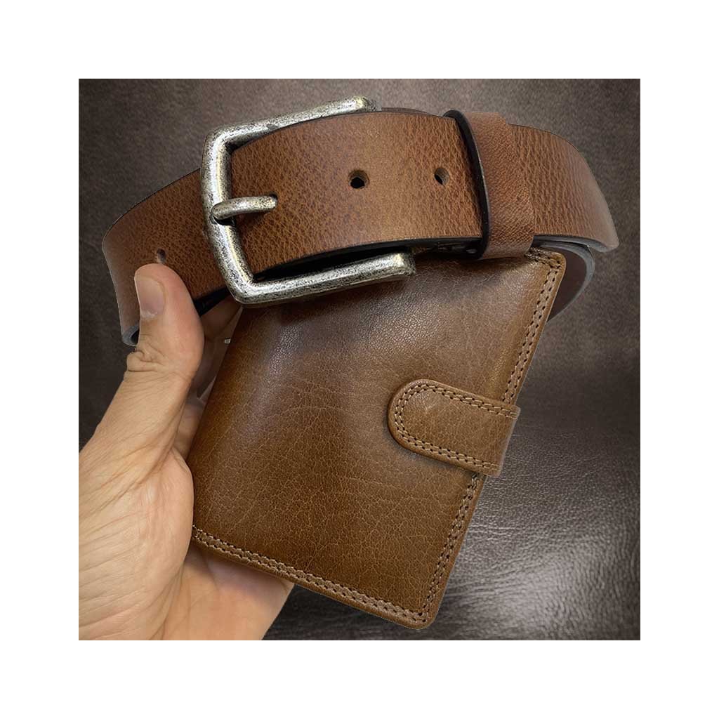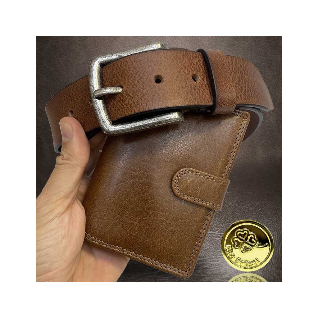 Spojení kvality, stylu a osobního detailu v jednom dárku. Tento prémiový set obsahuje hnědou peněženku na výšku se zapínáním a elegantní kožený pásek, oba vyrobené z pravé hovězí kůže a doplněné o ražbu vlastního monogramu.