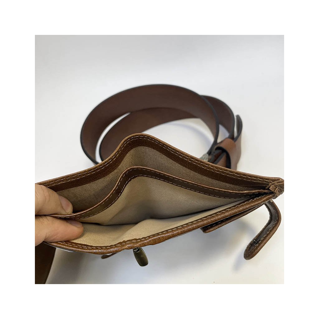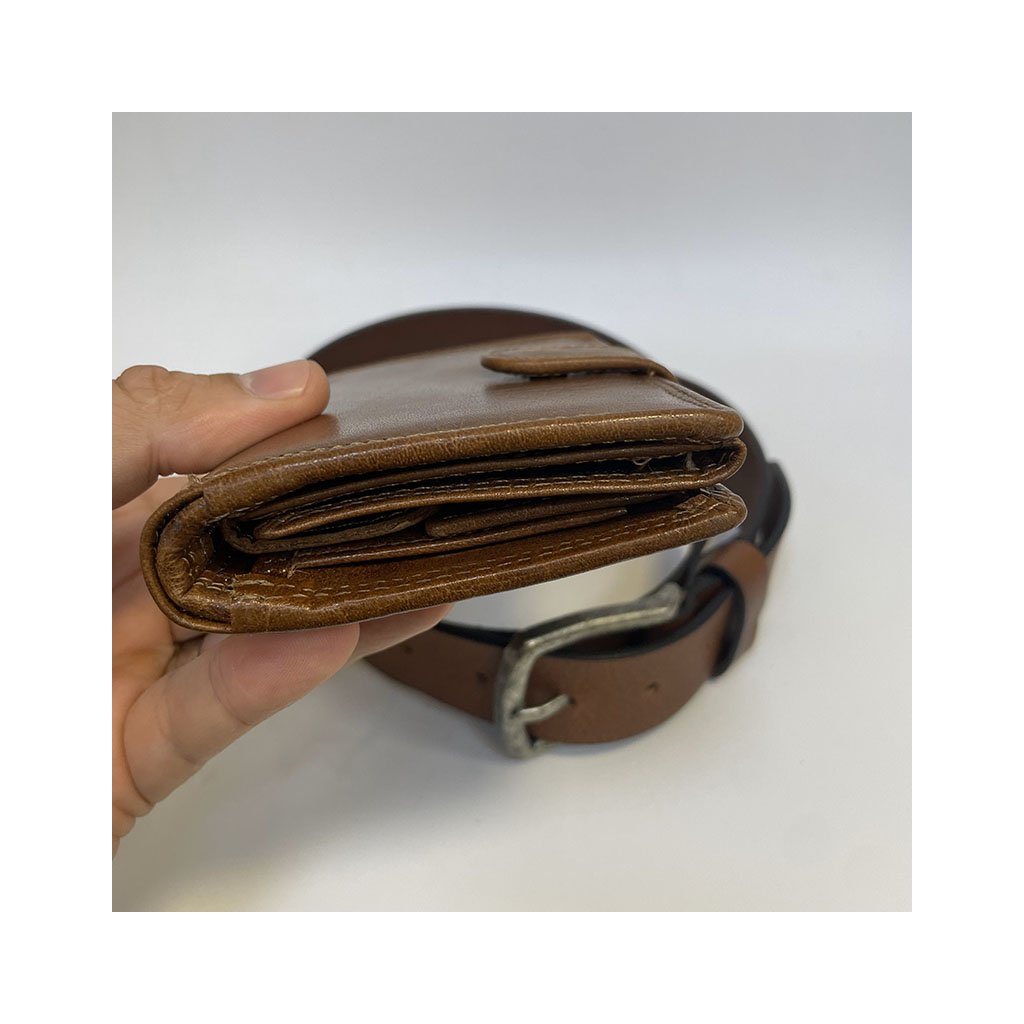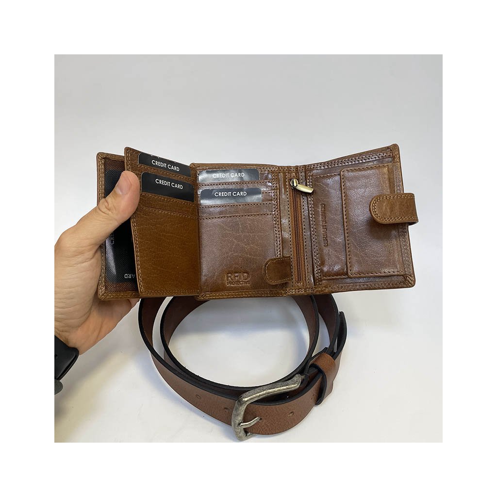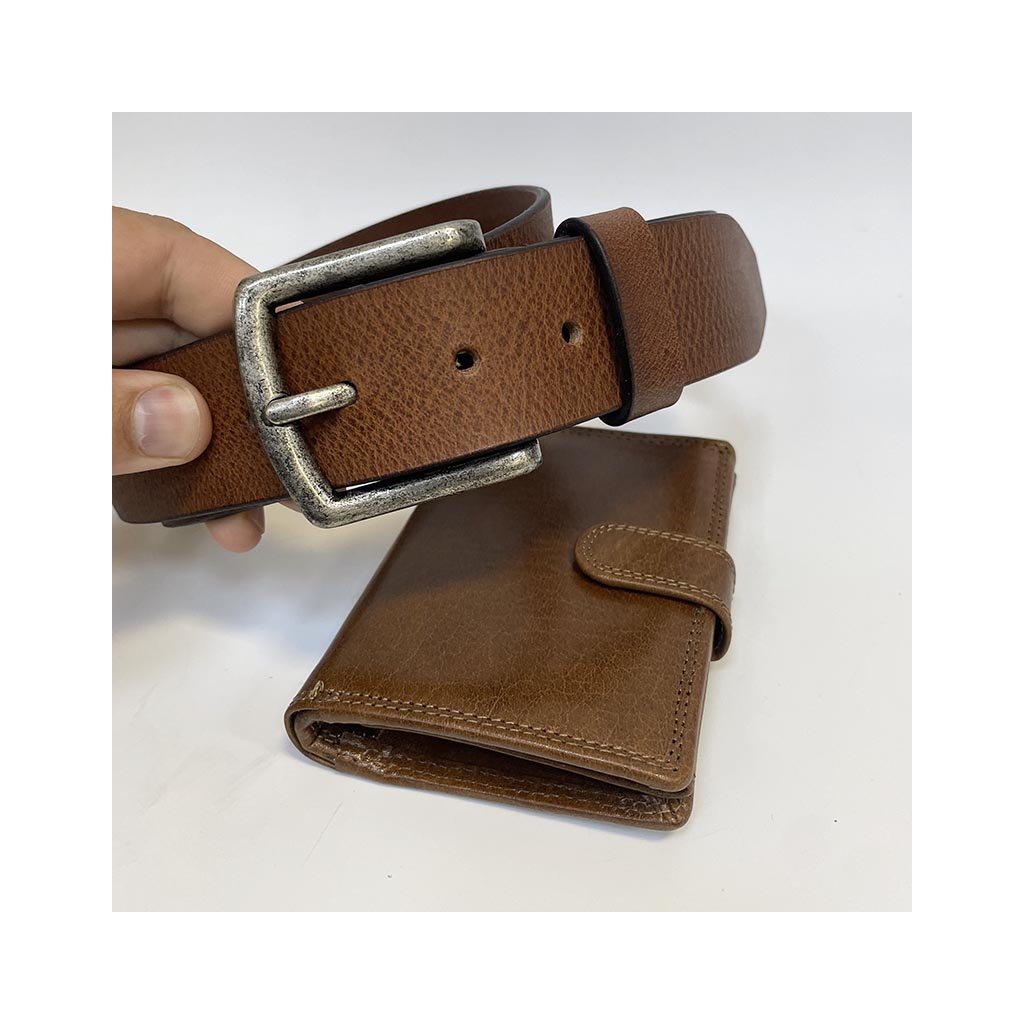 Spojení kvality, stylu a osobního detailu v jednom dárku. Tento prémiový set obsahuje hnědou peněženku na výšku se zapínáním a elegantní kožený pásek, oba vyrobené z pravé hovězí kůže a doplněné o ražbu vlastního monogramu.