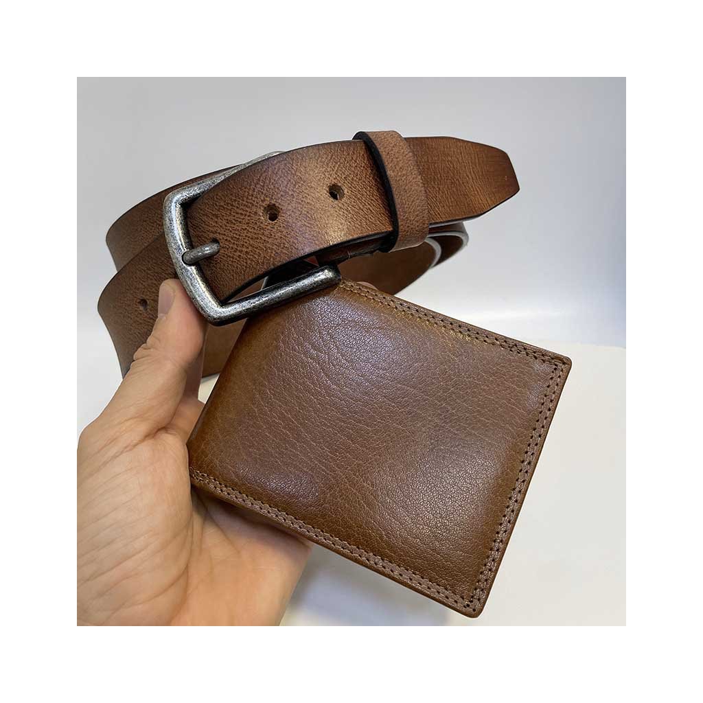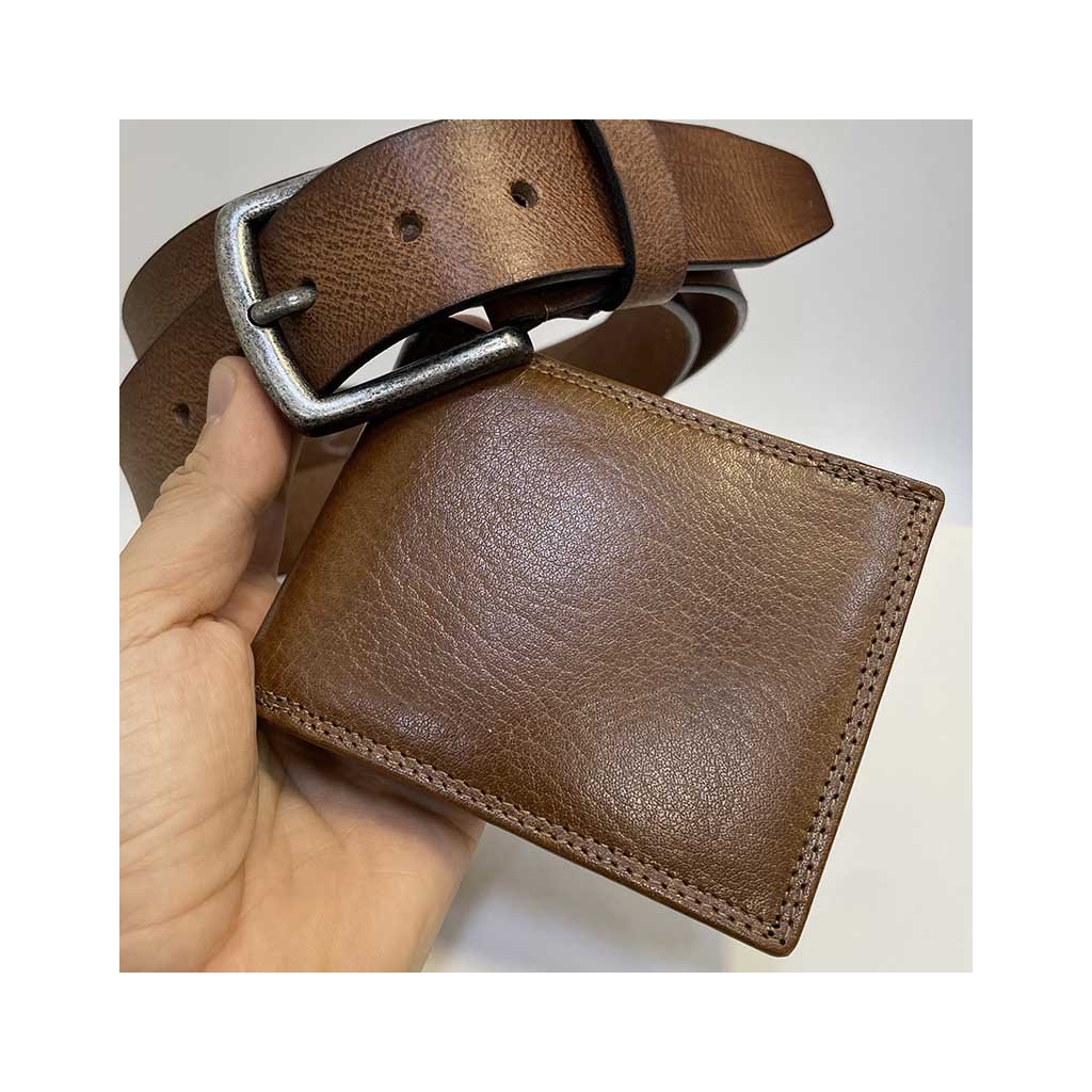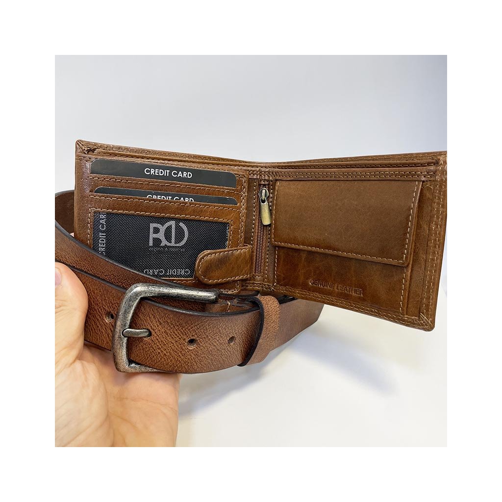 Pánský luxusní kožený set ROYAL LEATHER hnědá kožená peněženka a pásek s monogramem (ražba) + Akce - zlatá mince Pro štěstí ZDARMA