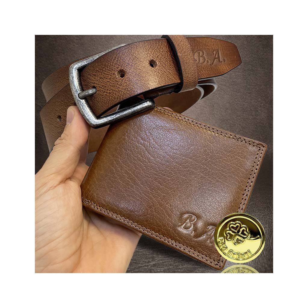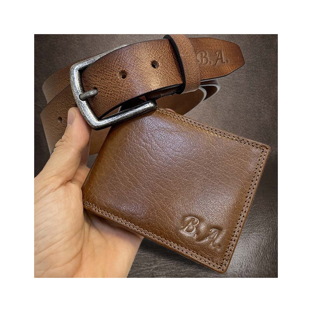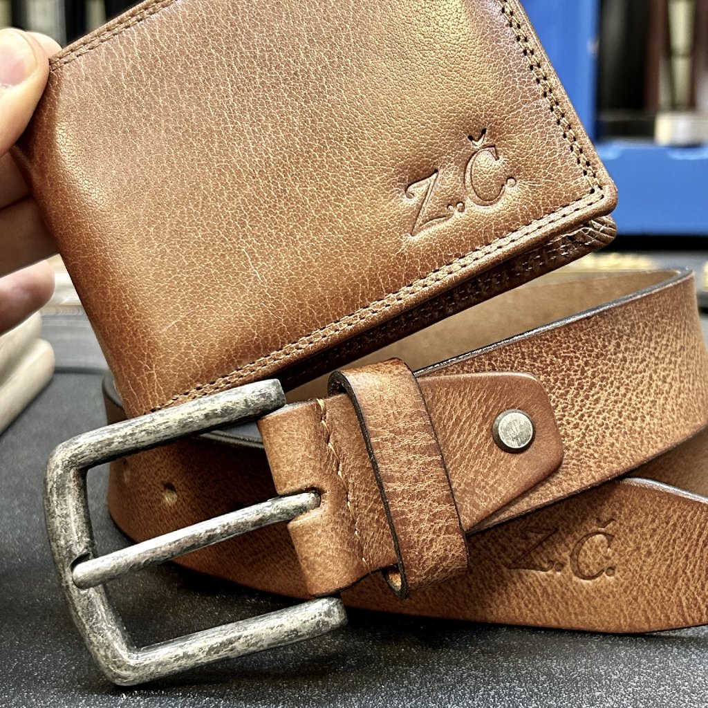 Elegantní kožený set peněženky a pásku s vlastním monogramem v hnědém provedení. Stylový dárek i praktický doplněk z pravé kůže.