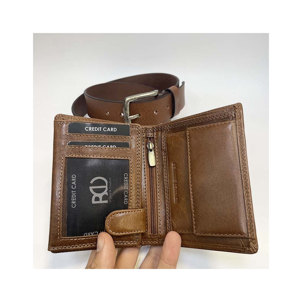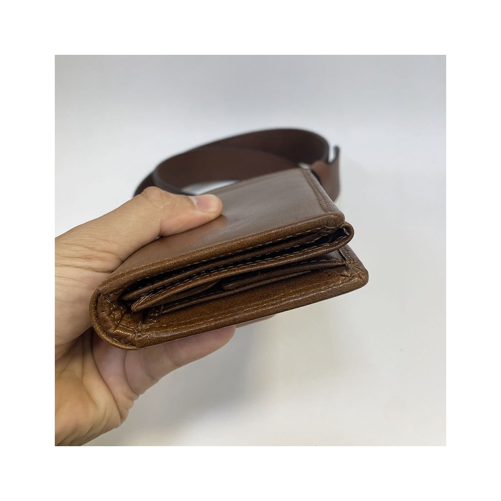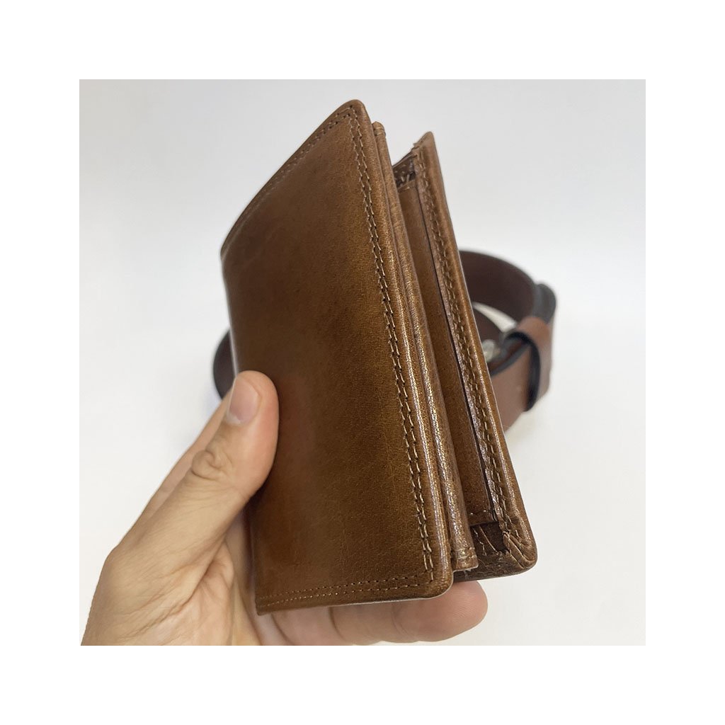 Obsahuje koženou peněženku na výšku bez zapínání, která působí elegantně a čistě, a pásek z pravé hovězí kůže, který můžete doplnit vlastním monogramem. Oba produkty jsou zpracovány z kvalitní hnědé kůže a dodávány v luxusním dárkovém balení.