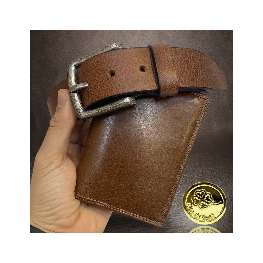 Pánský luxusní kožený set ROYAL LEATHER hnědá kožená peněženka a pásek s monogramem (ražba) + Akce - zlatá mince Pro štěstí ZDARMA