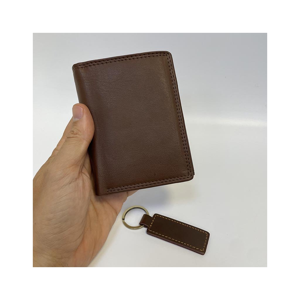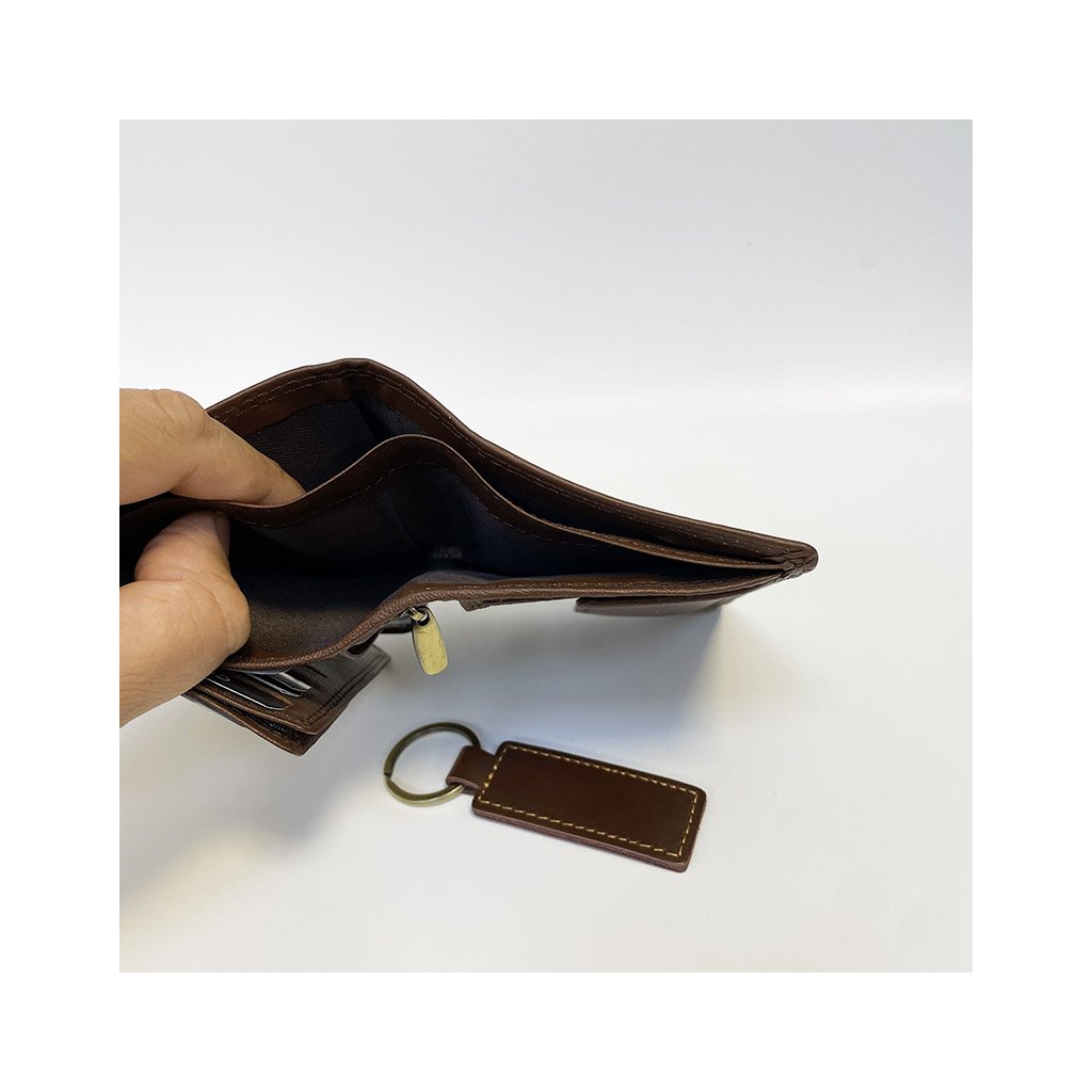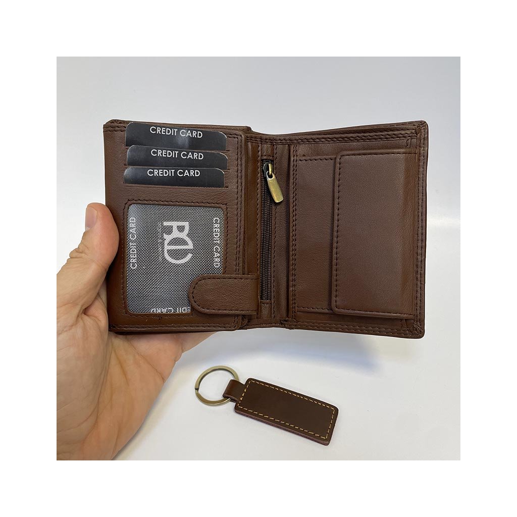 Stylový pánský kožený set spojuje elegantní peněženku na výšku bez zapínání a praktickou klíčenku – oboje z prvotřídní pravé hovězí kůže v nádherném hnědém odstínu. Každý kus může nést váš monogram, osobní text, věnování nebo dokonce vlastní fotografii díky preciznímu laserovému gravírování.