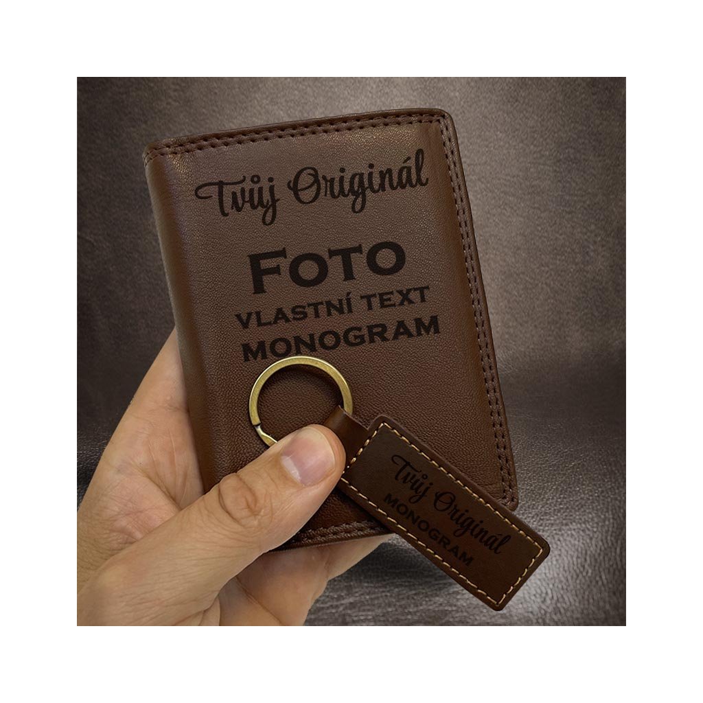 Pánský tmavě hnědý kožený set peněženky a klíčenky s vlastním monogramem, textem, fotkou + Akce - zlatá mince Pro štěstí ZDARMA