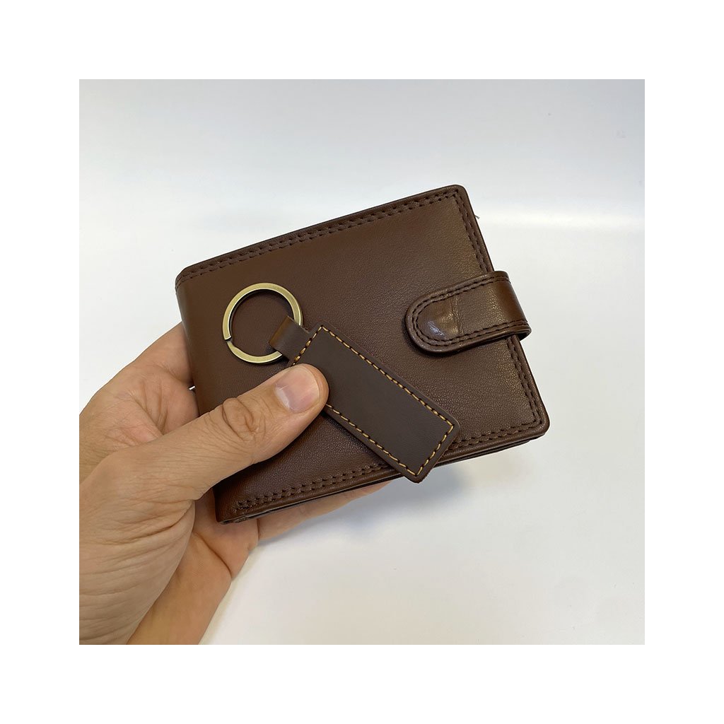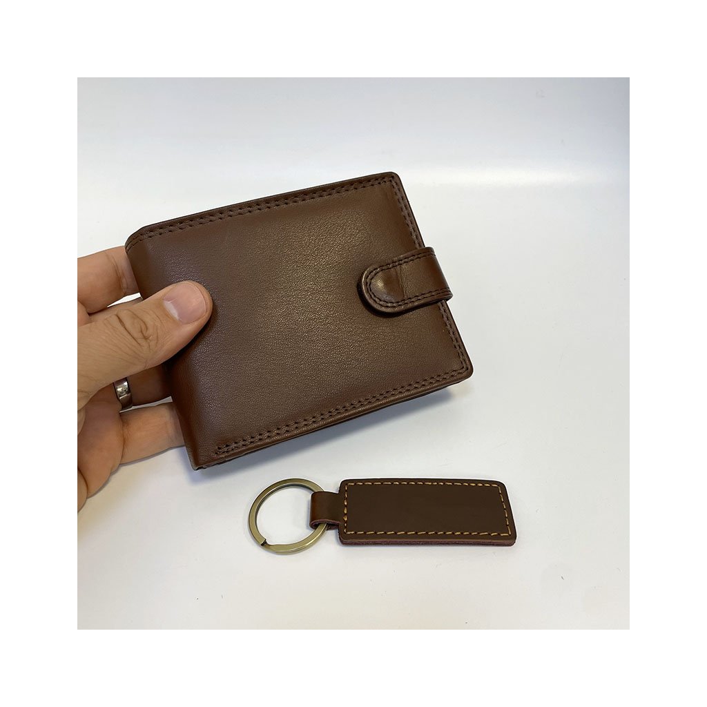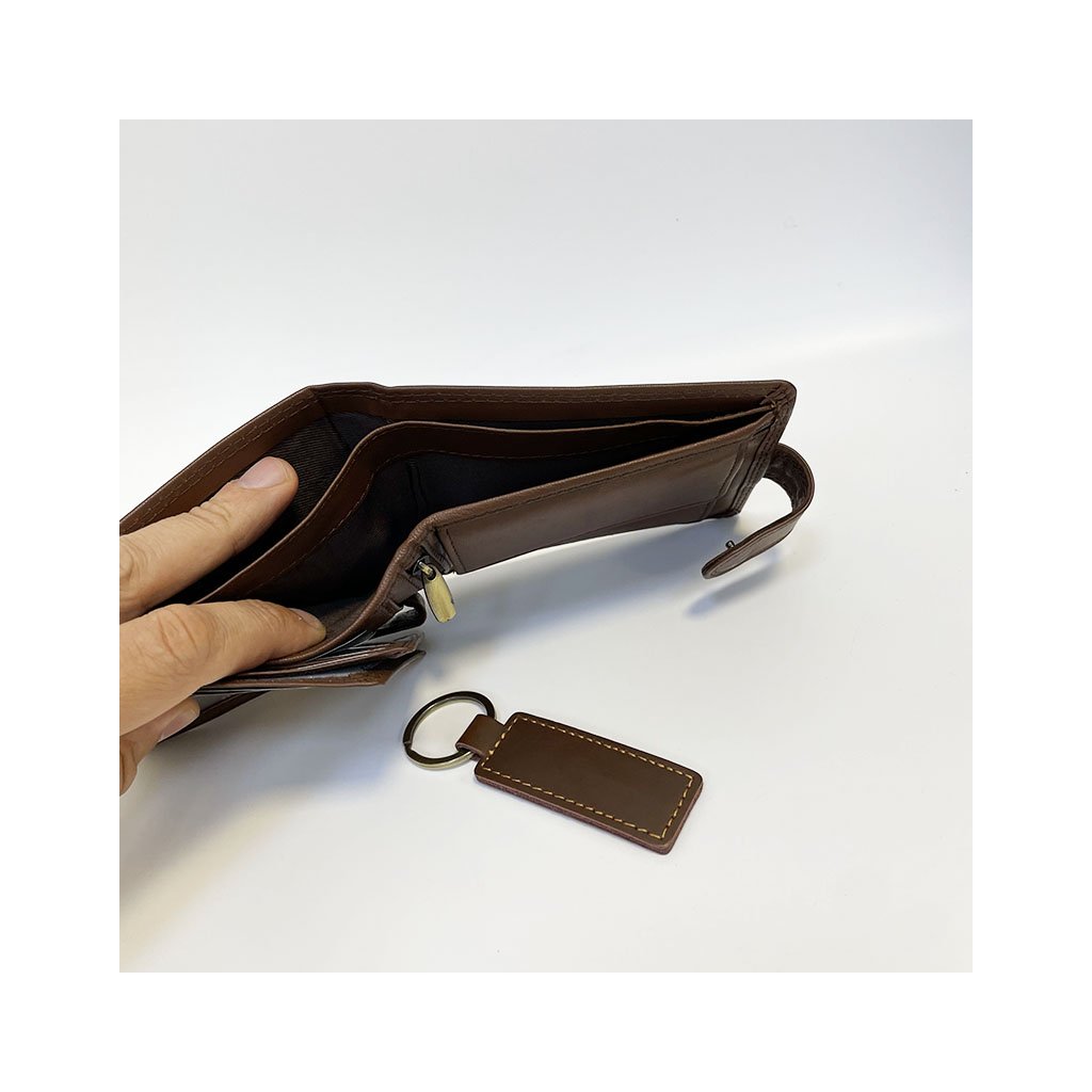 Tmavě hnědý kožený set: peněženka se zapínáním a klíčenka. Ražba monogramu v ceně. Gravírování textu, věnování, loga nebo fotky na přání.