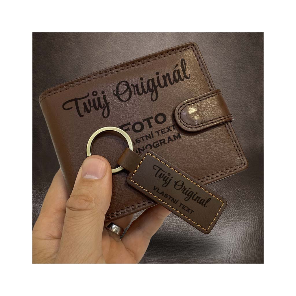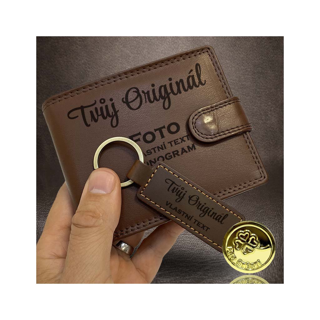 Pánský tmavě hnědý kožený set peněženky a klíčenky s vlastním monogramem, textem, fotkou + Akce - zlatá mince Pro štěstí ZDARMA