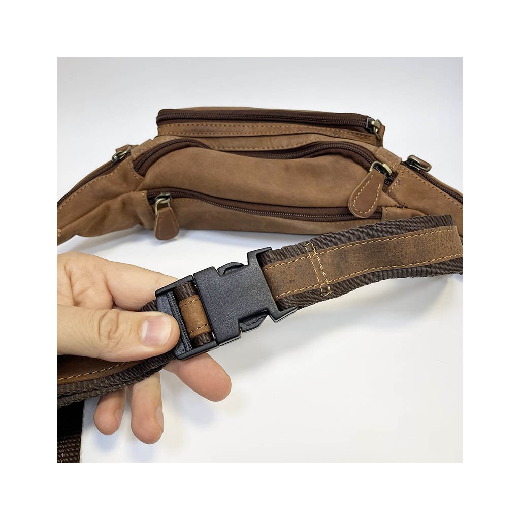 Jednoduchá moderní kožená ledvinka se spoustou kapes na zip. Klasický nastavitelný textilní pásek s plastovou sponou. Velmi vhodné např. na dovolené,