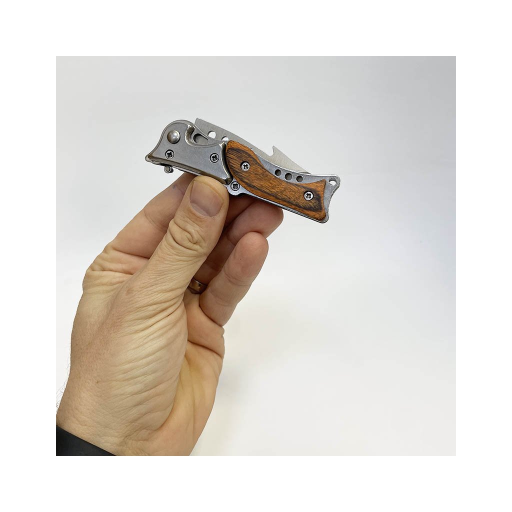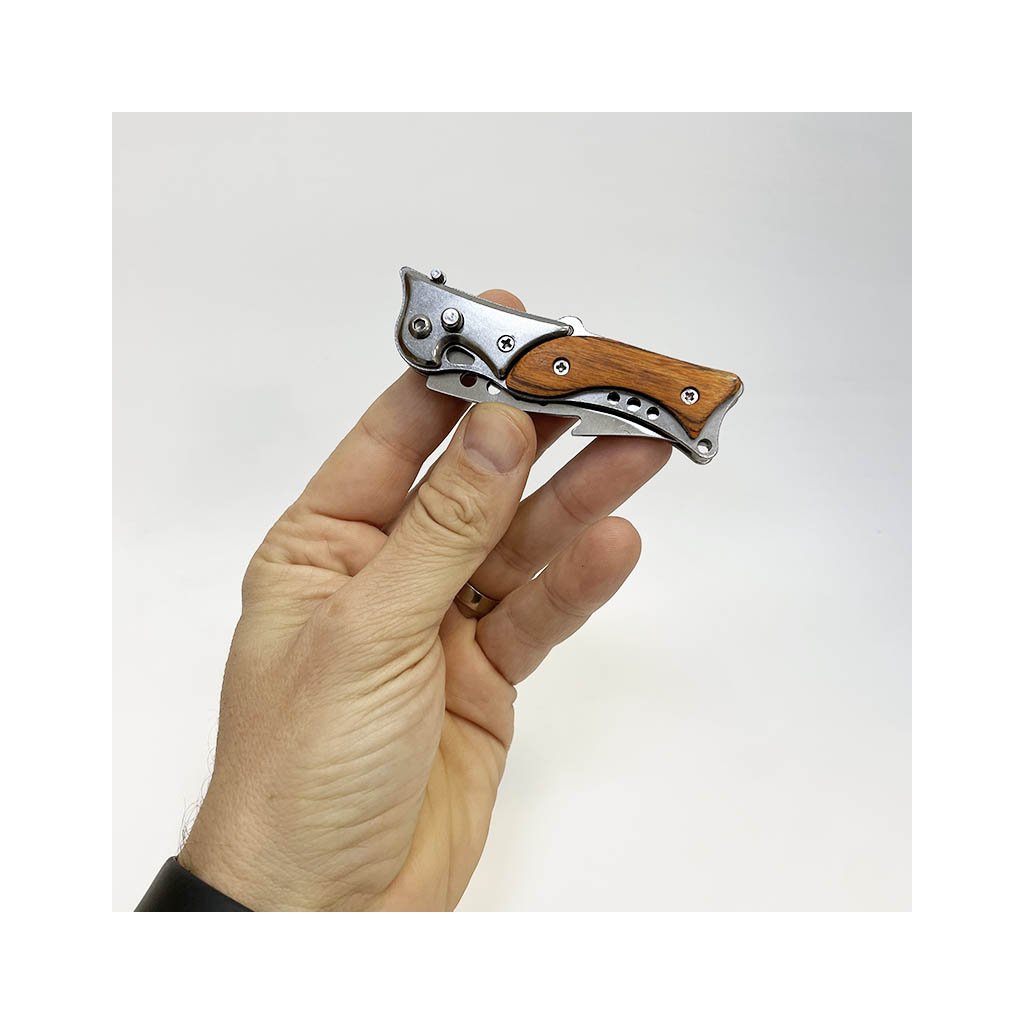 Stylový vyklápěcí nůž s dřevěnou rukojetí a možností vlastního textu. Včetně pouzdra a dárkového balení. Klasika, která potěší i překvapí.