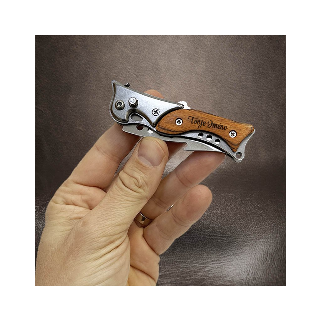 Stylový kvalitní vyklápěcí nůž s dřevěnou rukojetí a možností gravírování vlastního textu. K noži lze dokoupit kožené pouzdro s personalizací – ideální dárek na míru.
