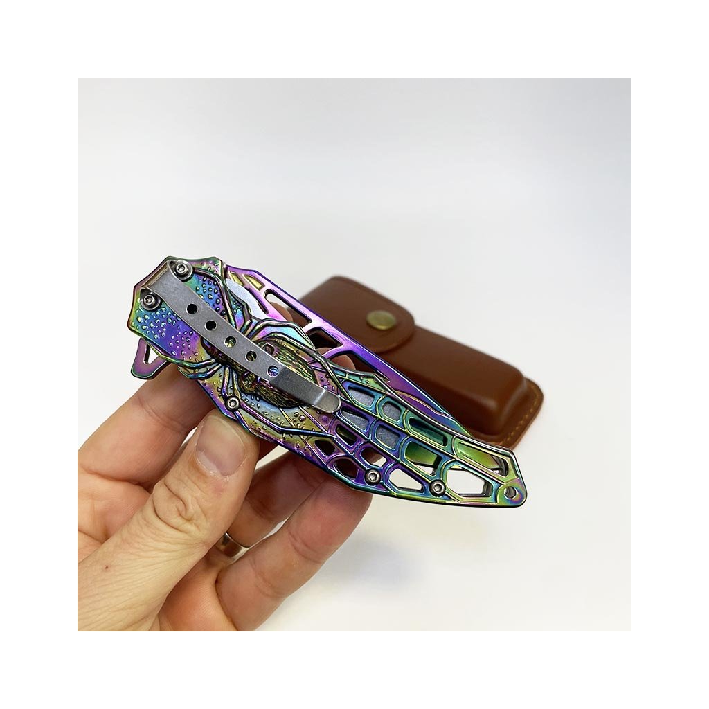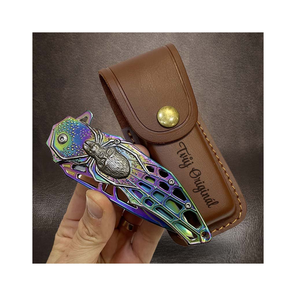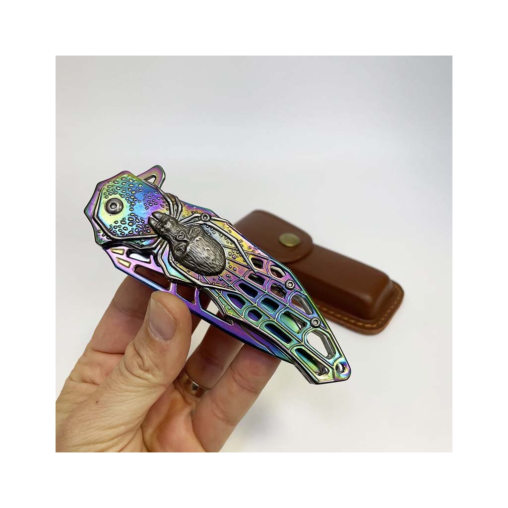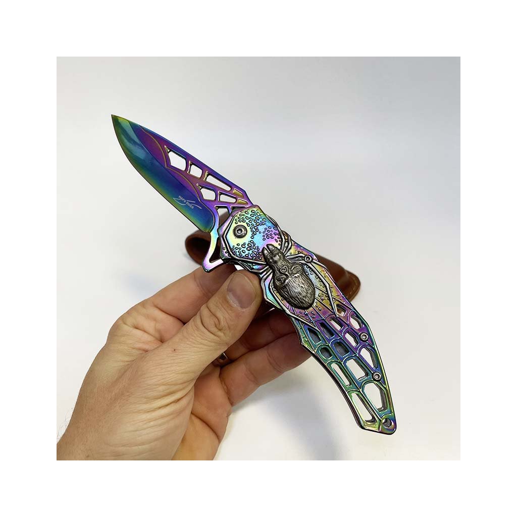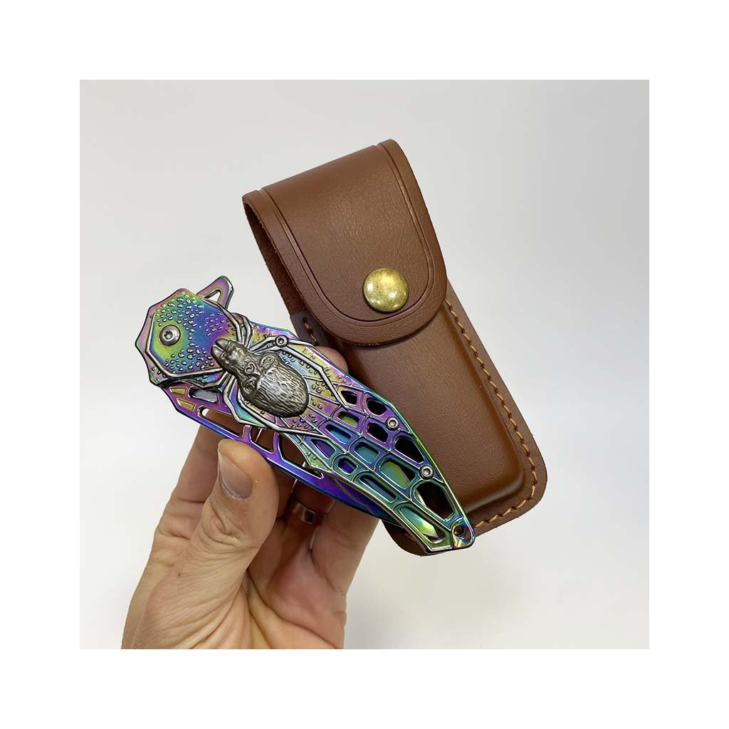 Nádherný kousek, extra kvalitní kovový vyklápěcí nůž s nádhernou reliéfní strukturou pavouka na rukojeti. Reliefní části jsou leštěné do duhových barev. Navíc včetně koženého pouzdra, na které lze vyhotovit jedinečný a originální motiv, text, monogram.