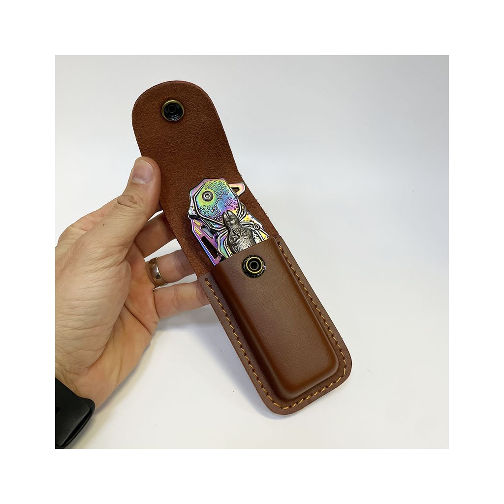 Designový vyklápěcí nůž s výrazným reliéfem listu marihuany. Včetně koženého pouzdra s možností gravírování vlastního textu či monogramu. Osobitý styl pro ty, kteří chtějí něco...