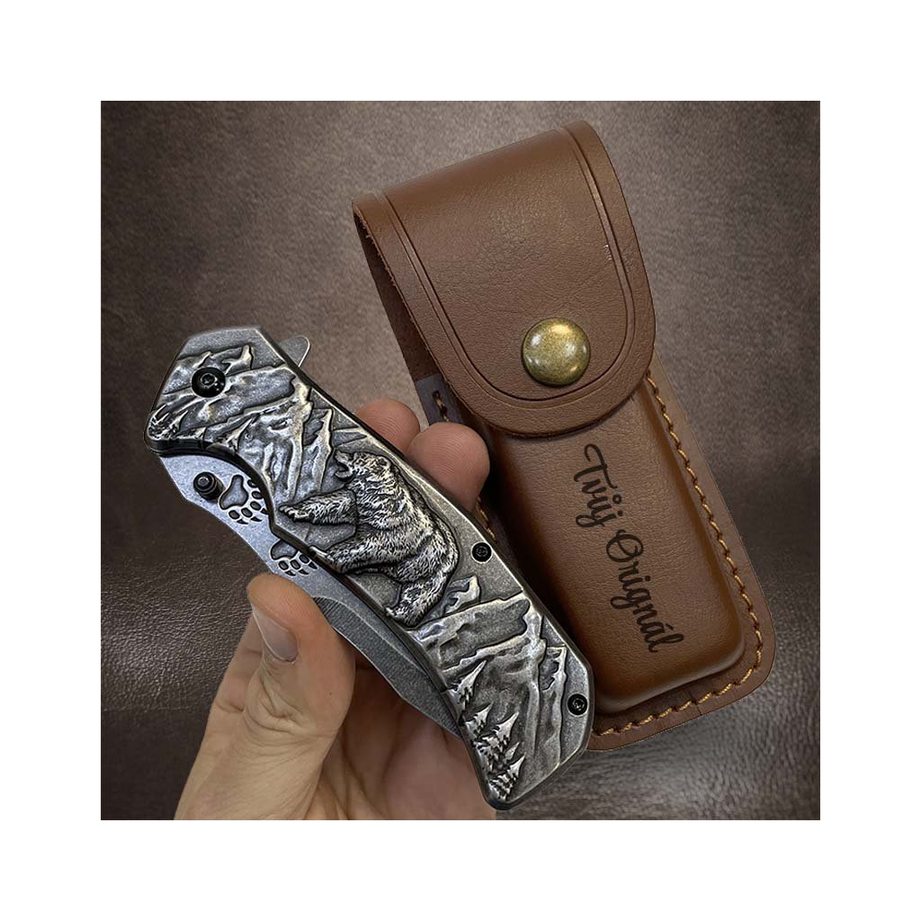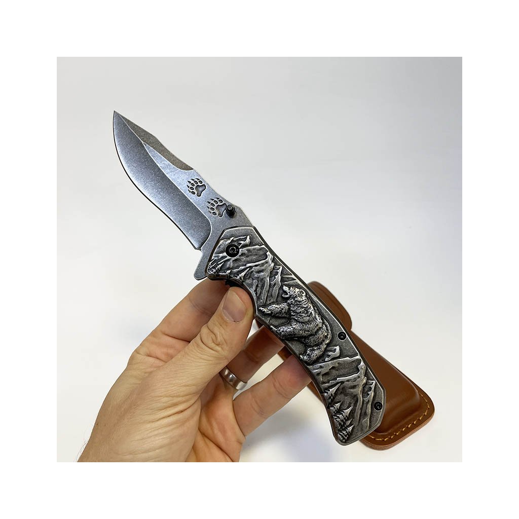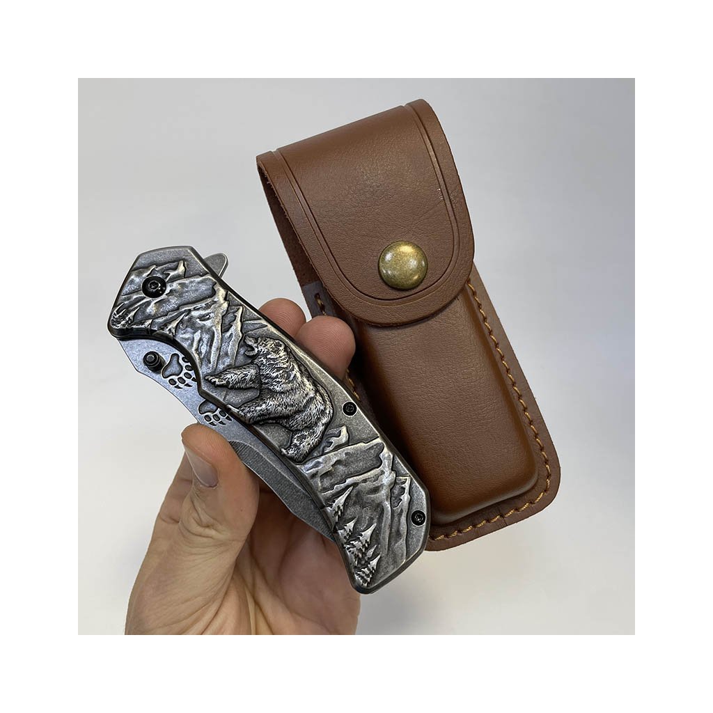 Nádherný kousek, extra kvalitní kovový vyklápěcí nůž s nádhernou reliéfní strukturou medvěda na rukojeti. Navíc včetně koženého pouzdra, na které lze vyhotovit jedinečný a originální motiv, text, monogram.