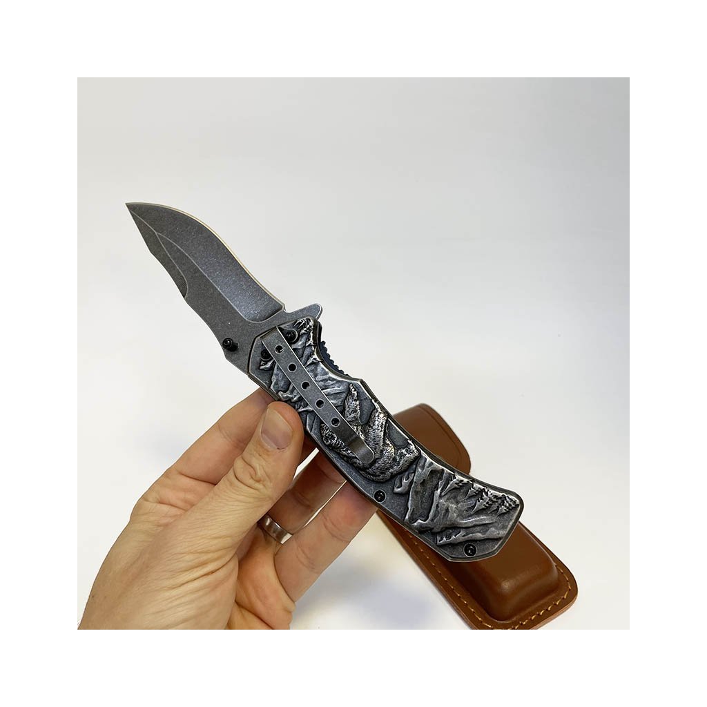 Prémiový reliéfní vyklápěcí nůž GRIZLY s možností koženého pouzdra s vlastním textem + prémiové dárkové balení BE Original