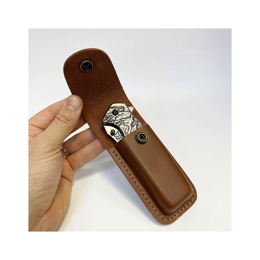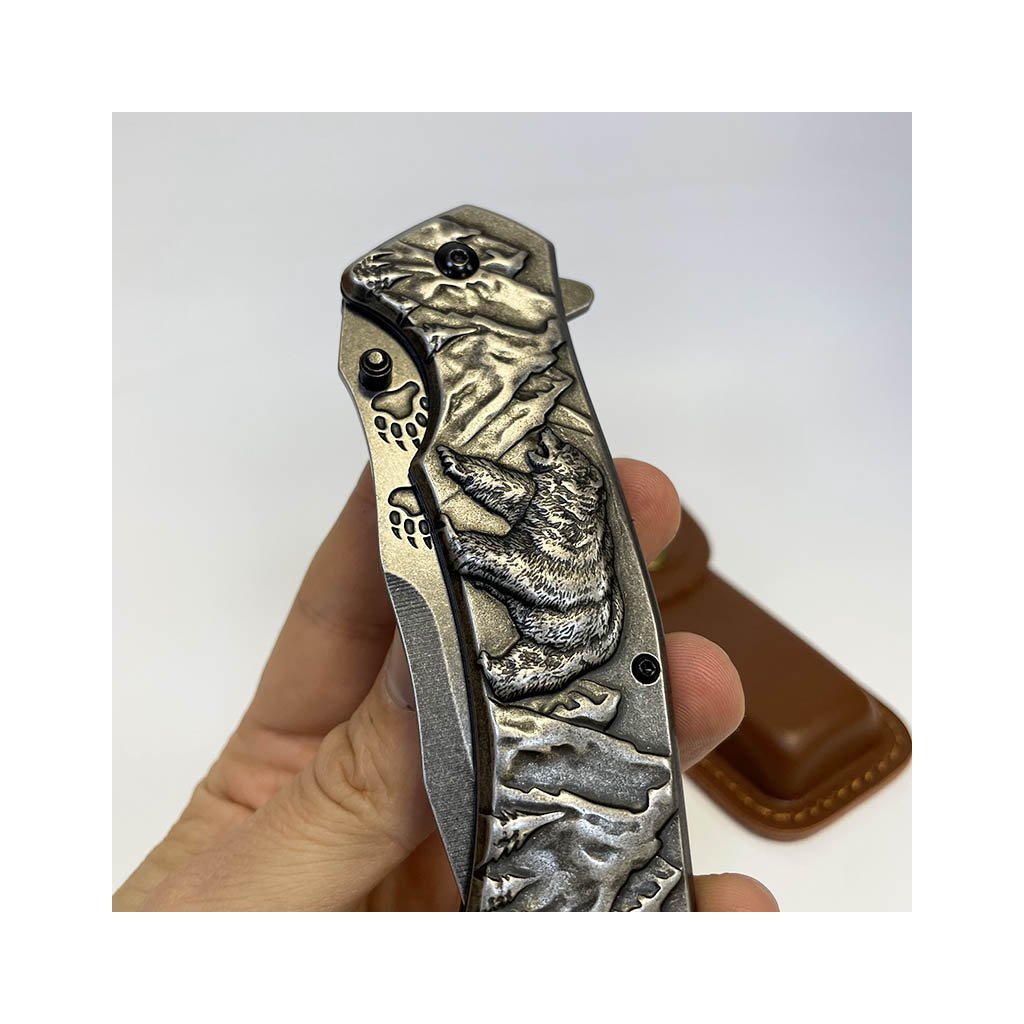 Luxusní vyklápěcí nůž s detailním reliéfem vlka a kvalitním koženým pouzdrem. Vlastní text, monogram či motiv na pouzdře z něj udělají originální dárek nebo osobní talisman.