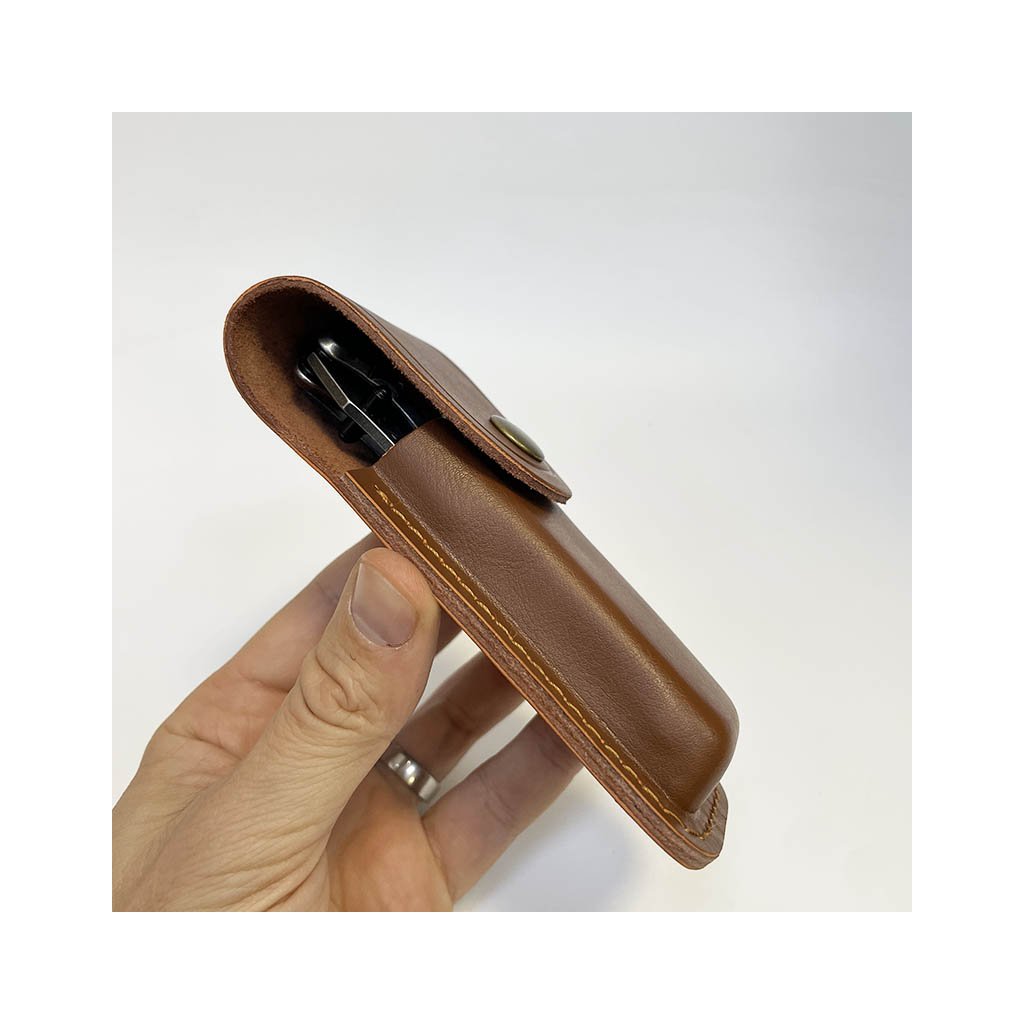 Elegantní vyklápěcí nůž s délkou 19,5 cm při otevření, doplněný koženým pouzdrem. Možnost vlastního gravírování na pouzdro – motiv, text nebo monogram. Originální dárek na míru.