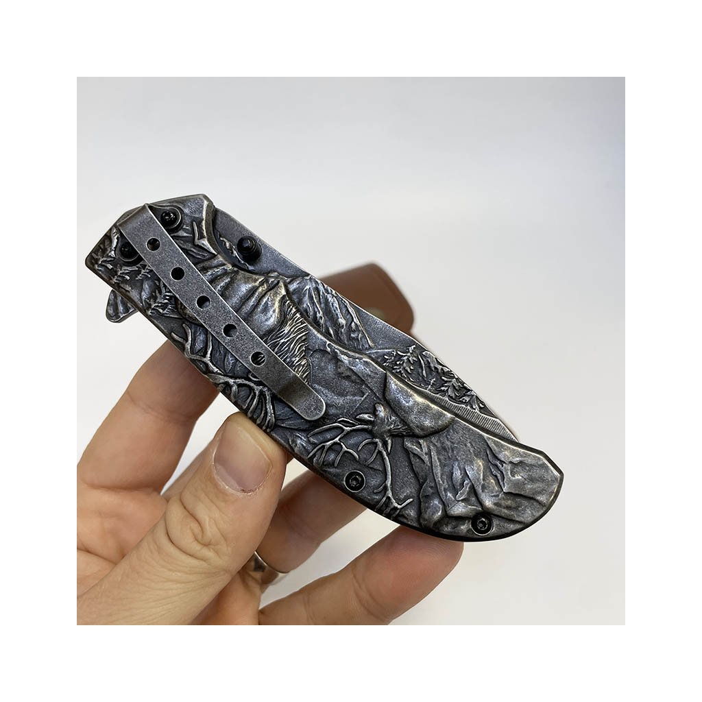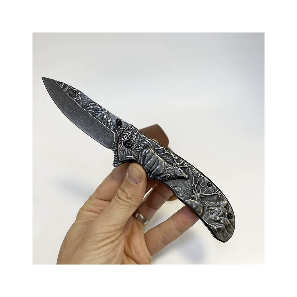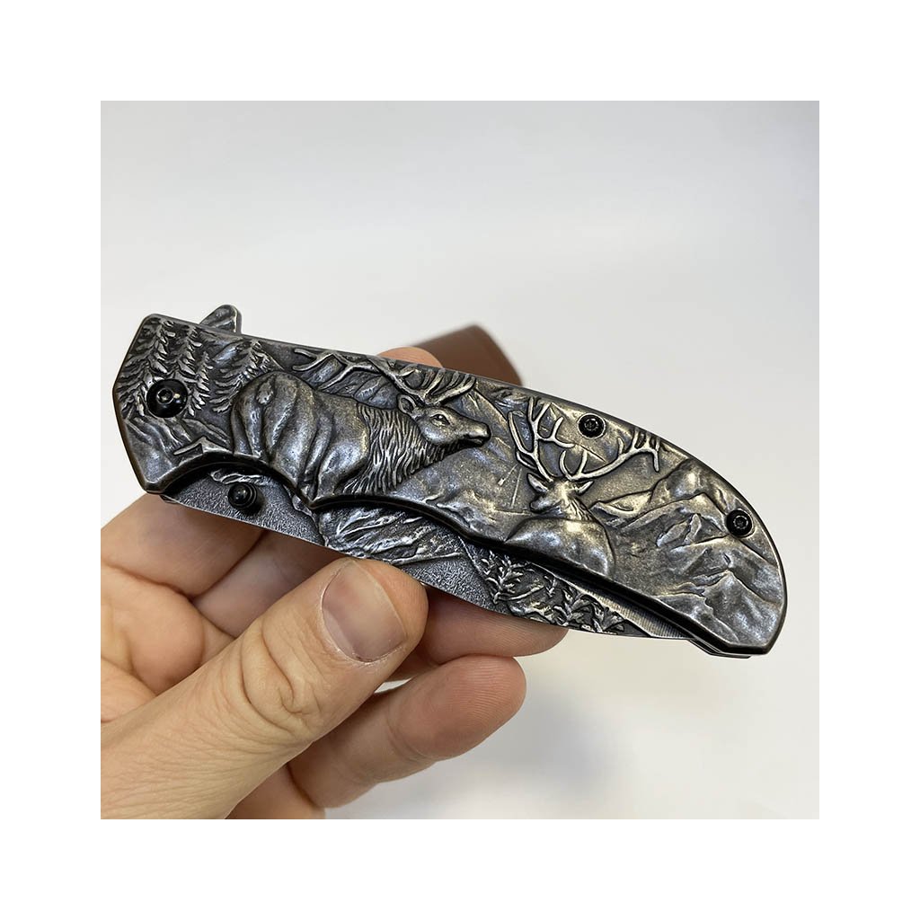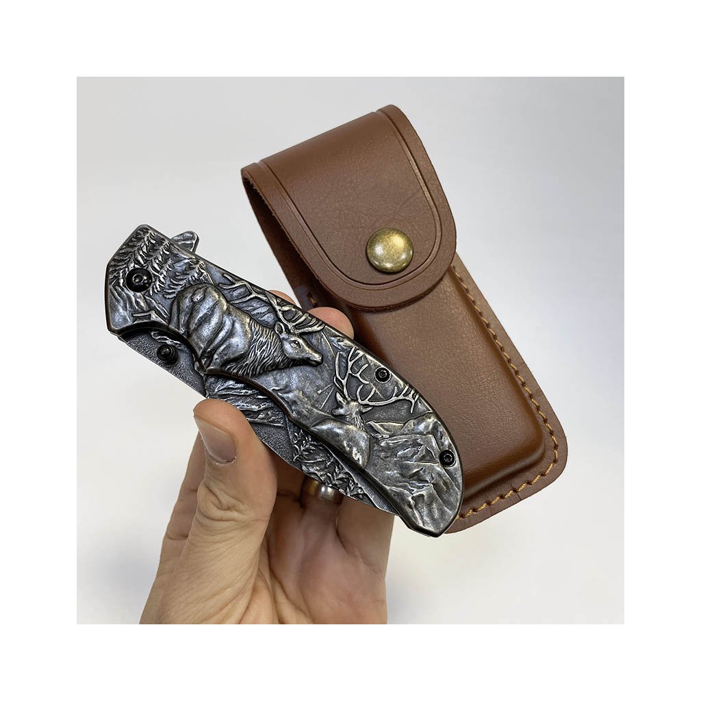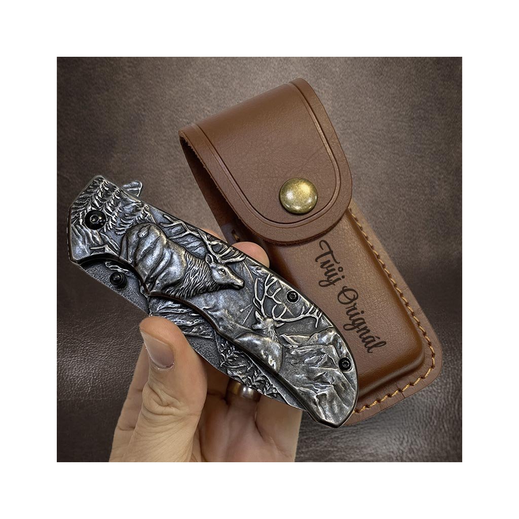 Nádherný kousek, extra kvalitní kovový vyklápěcí nůž s nádhernou reliéfní strukturou jelena na rukojeti. Navíc včetně koženého pouzdra, na které lze vyhotovit jedinečný a originální motiv, text, monogram.