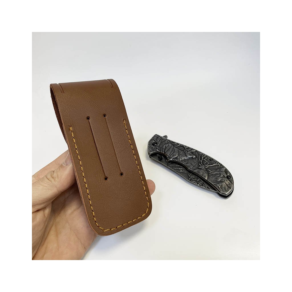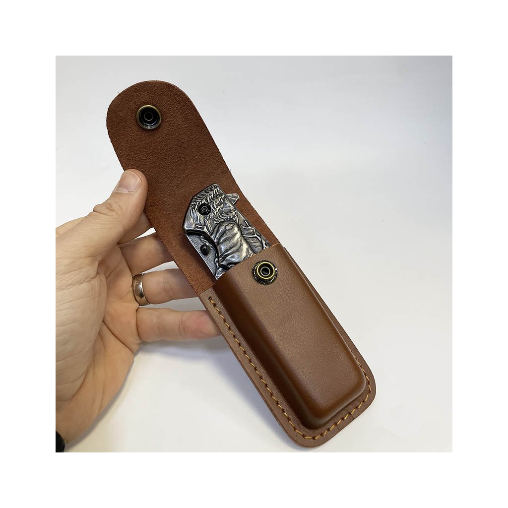 Elegantní kovový vyklápěcí nůž s reliéfní rukojetí a koženým pouzdrem. Osobní gravírování z něj udělá jedinečný a hodnotný dárek.