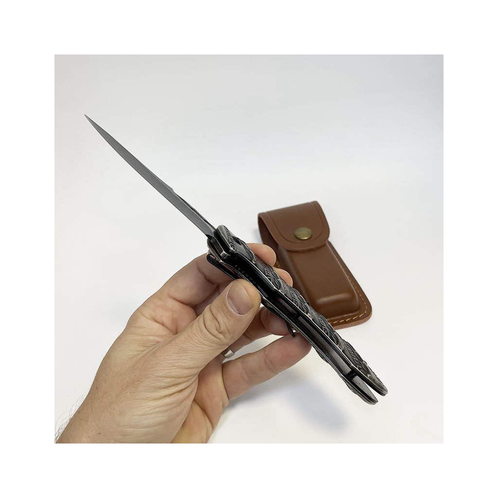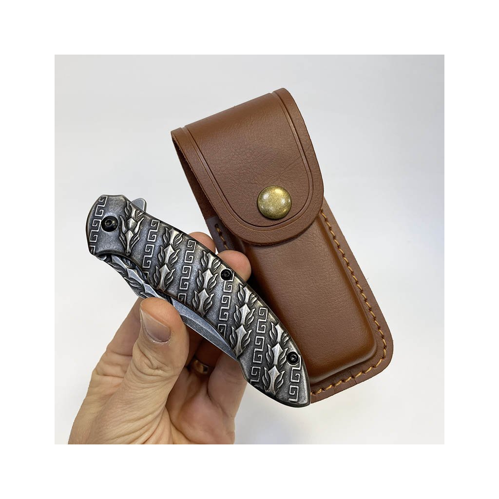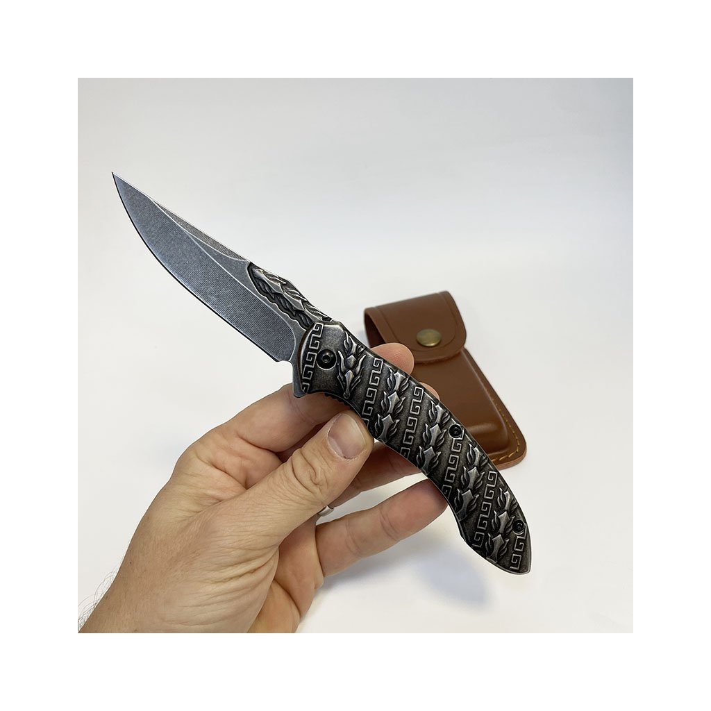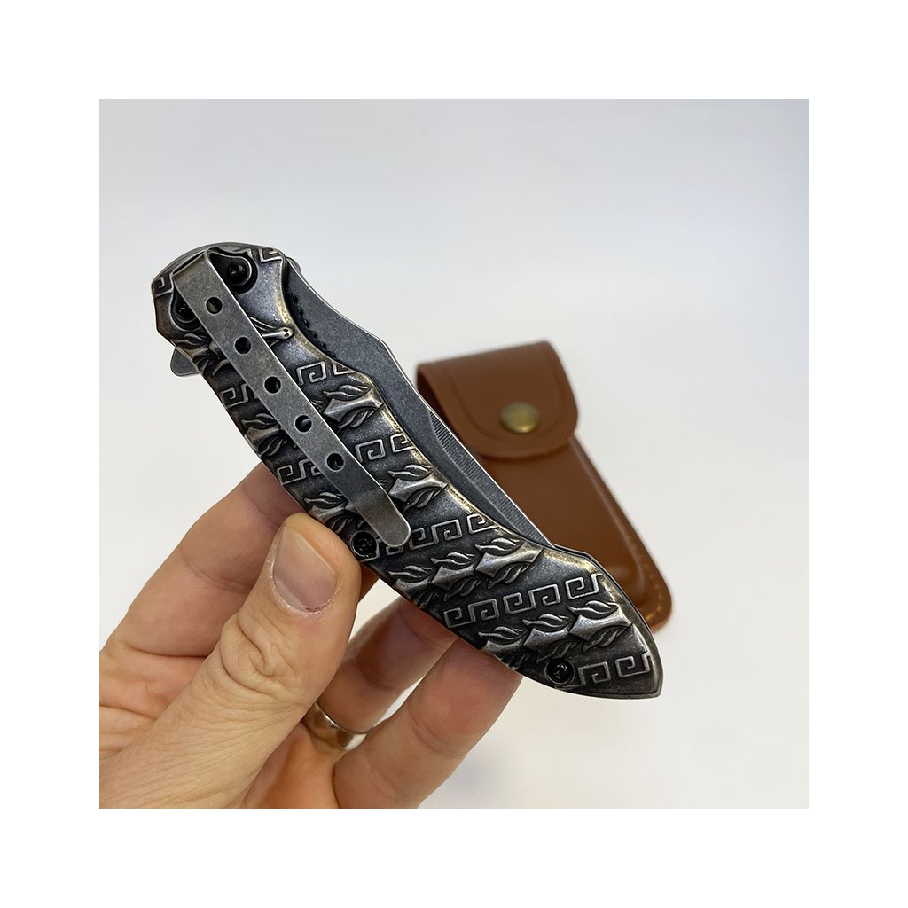 Nádherný kousek, extra kvalitní kovový vyklápěcí nůž s nádhernou reliéfní strukturou na rukojeti. Navíc včetně koženého pouzdra, na které lze vyhotovit jedinečný a originální motiv, text, monogram.