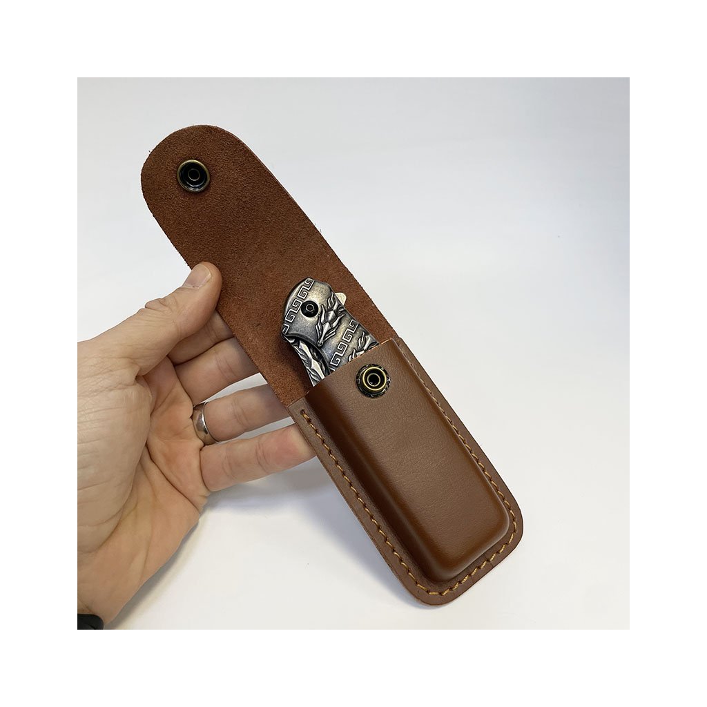 Luxusní vyklápěcí nůž s detailním reliéfem vlka a kvalitním koženým pouzdrem. Vlastní text, monogram či motiv na pouzdře z něj udělají originální dárek nebo osobní talisman.