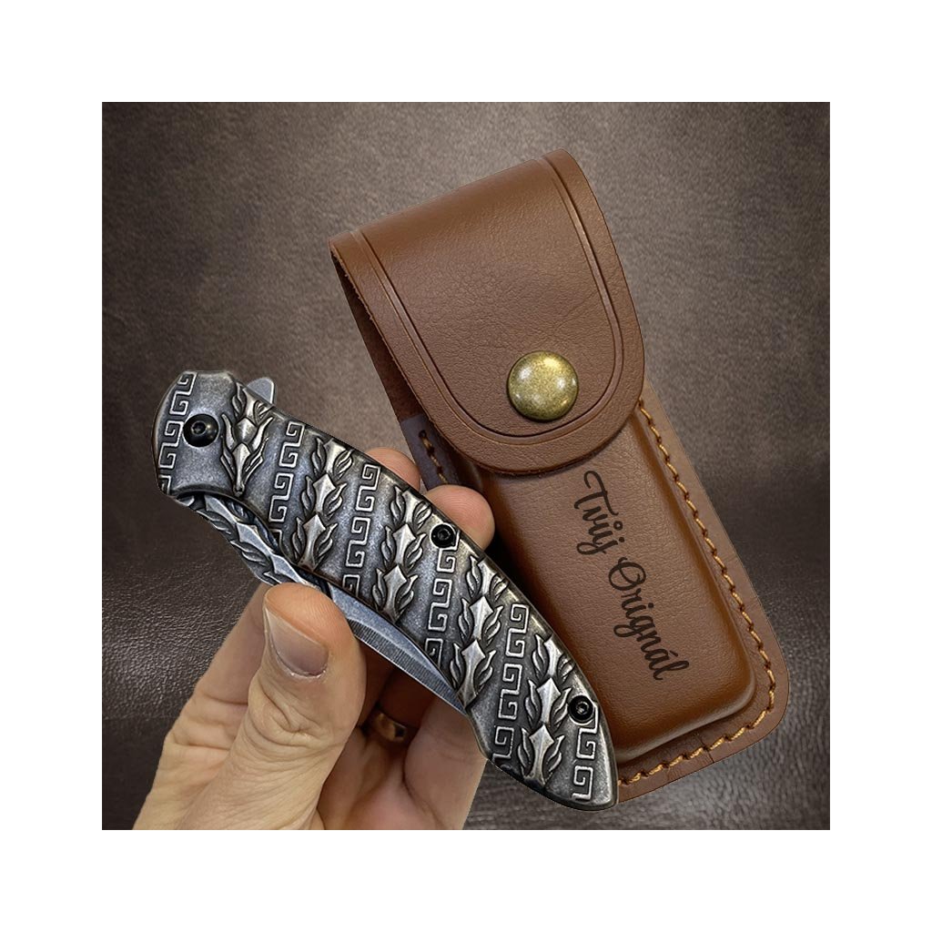 Luxusní reliéfní prémiový vyklápěcí nůž včetně koženého pouzdra, navíc monogram, text, motiv