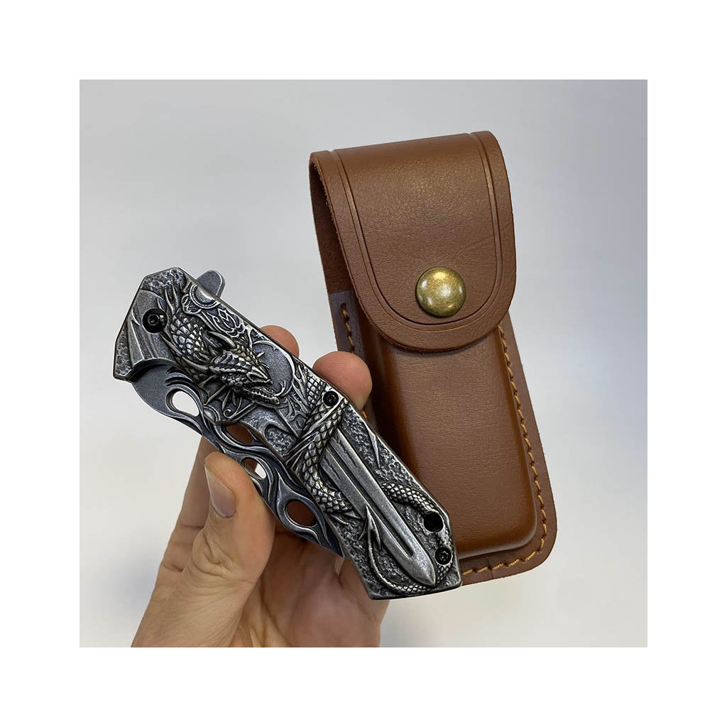 Elegantní kovový vyklápěcí nůž s reliéfní rukojetí a koženým pouzdrem. Osobní gravírování z něj udělá jedinečný a hodnotný dárek.