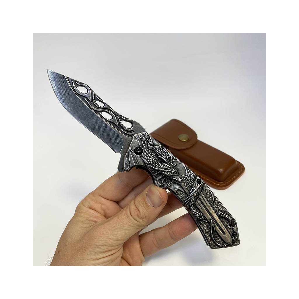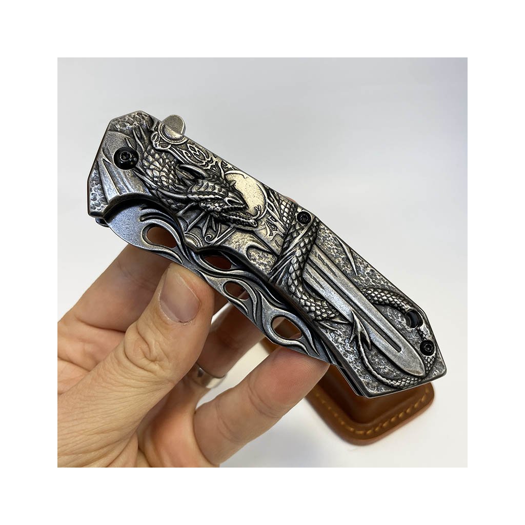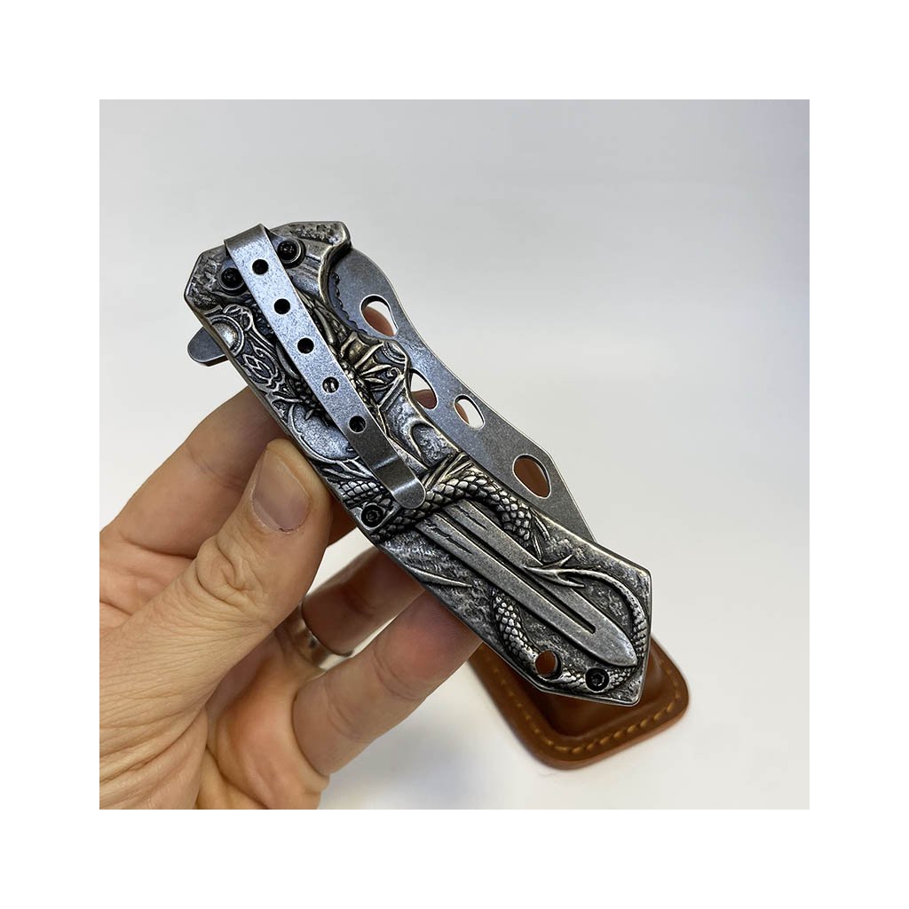 Nádherný kousek, extra kvalitní kovový vyklápěcí nůž s nádhernou reliéfní strukturou hada na rukojeti. Navíc včetně koženého pouzdra, na které lze vyhotovit jedinečný a originální motiv, text, monogram.