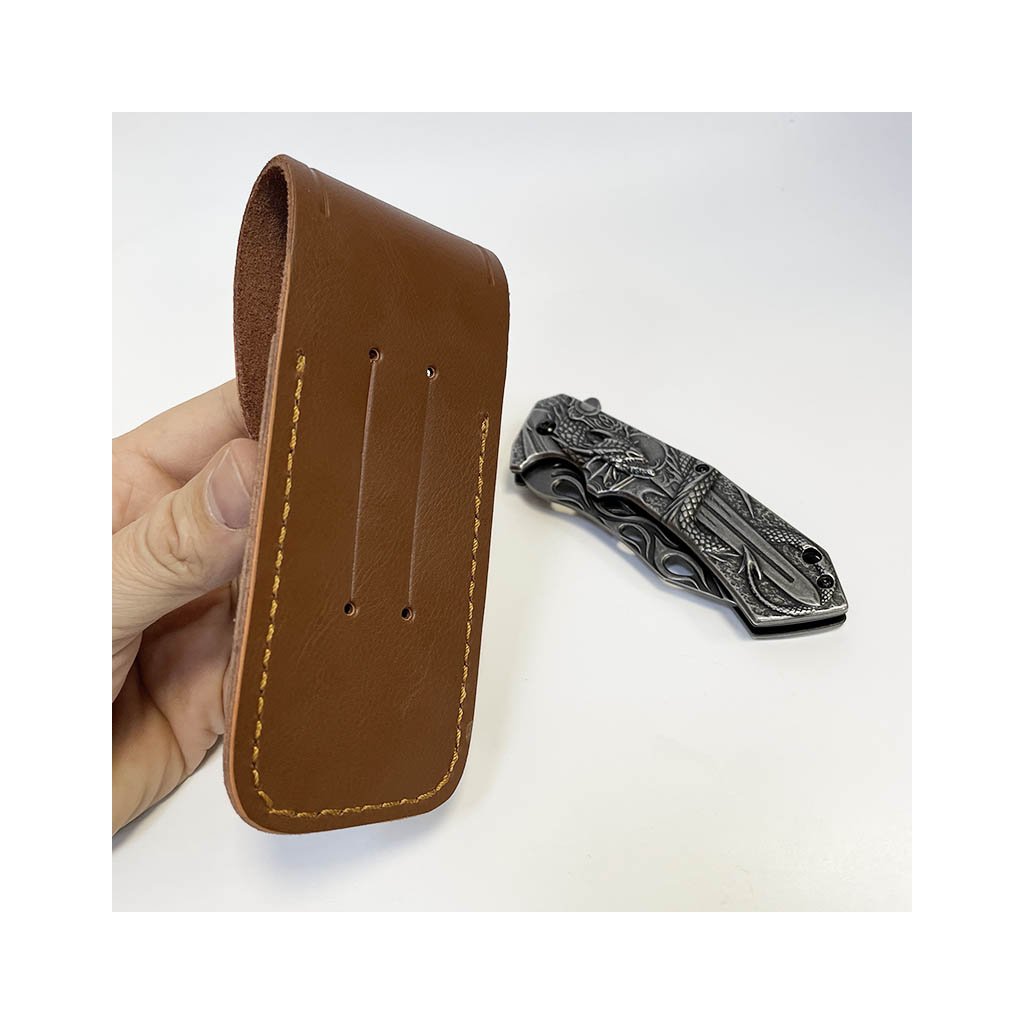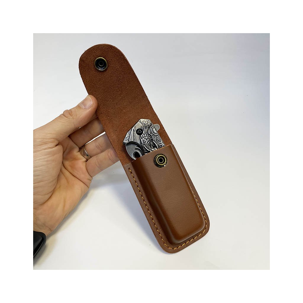 Elegantní vyklápěcí nůž s délkou 19,5 cm při otevření, doplněný koženým pouzdrem. Možnost vlastního gravírování na pouzdro – motiv, text nebo monogram. Originální dárek na míru.