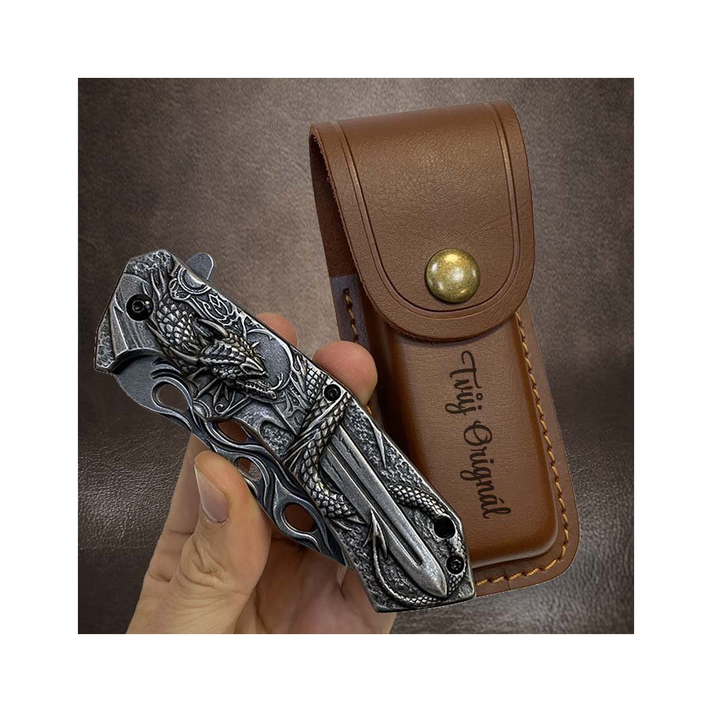 Prémiový reliéfní vyklápěcí nůž SNAKE s možností koženého pouzdra s vlastním textem + prémiové dárkové balení BE Original