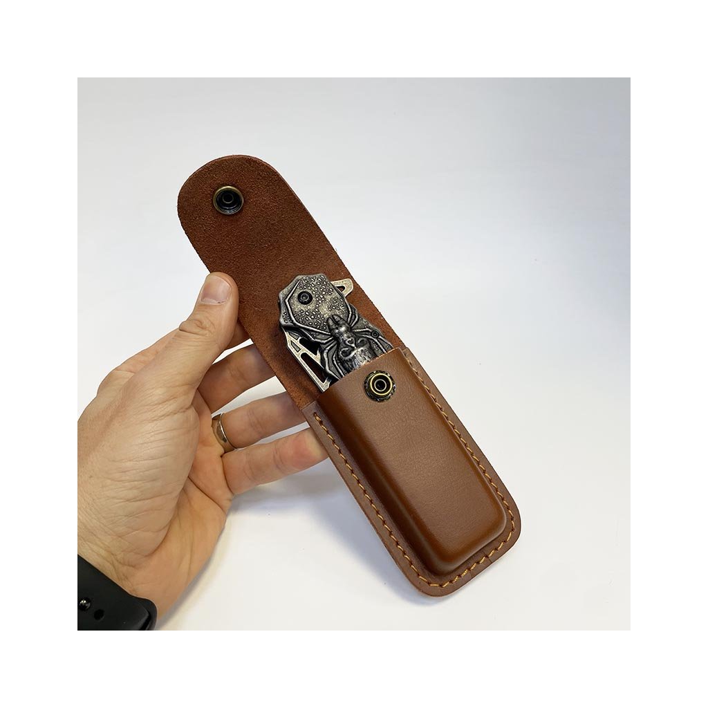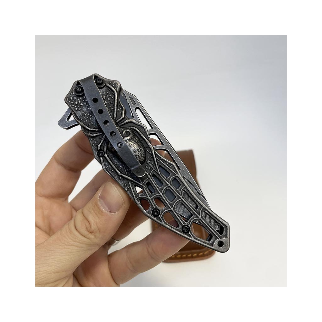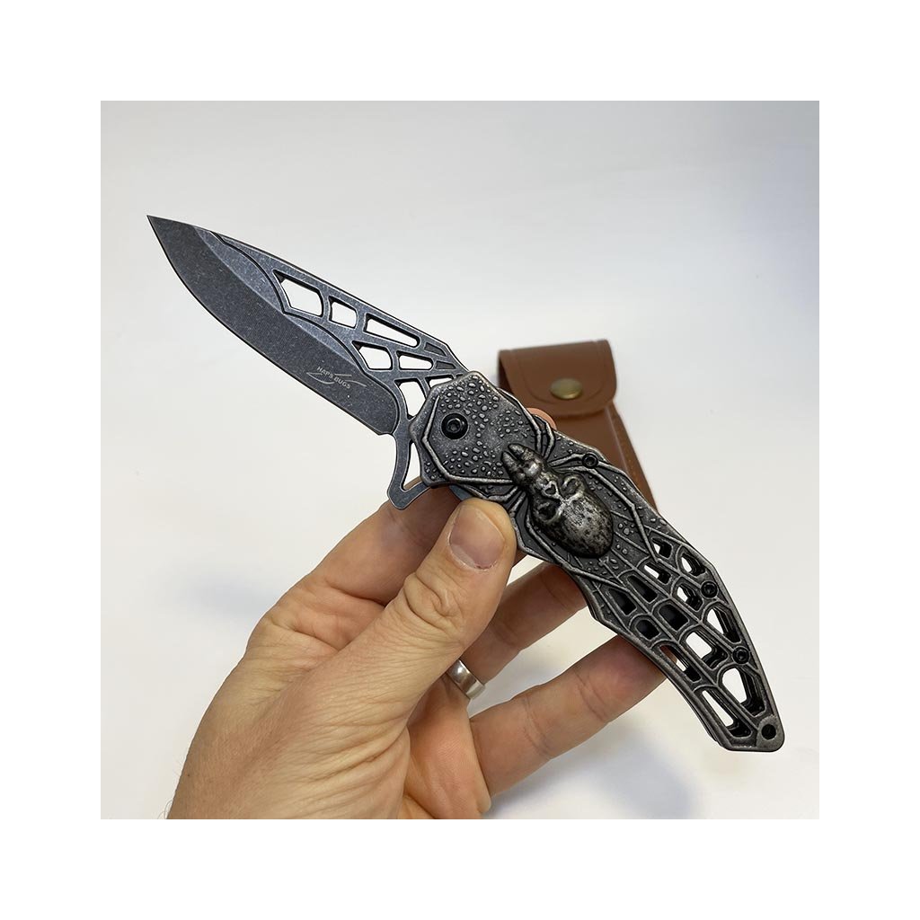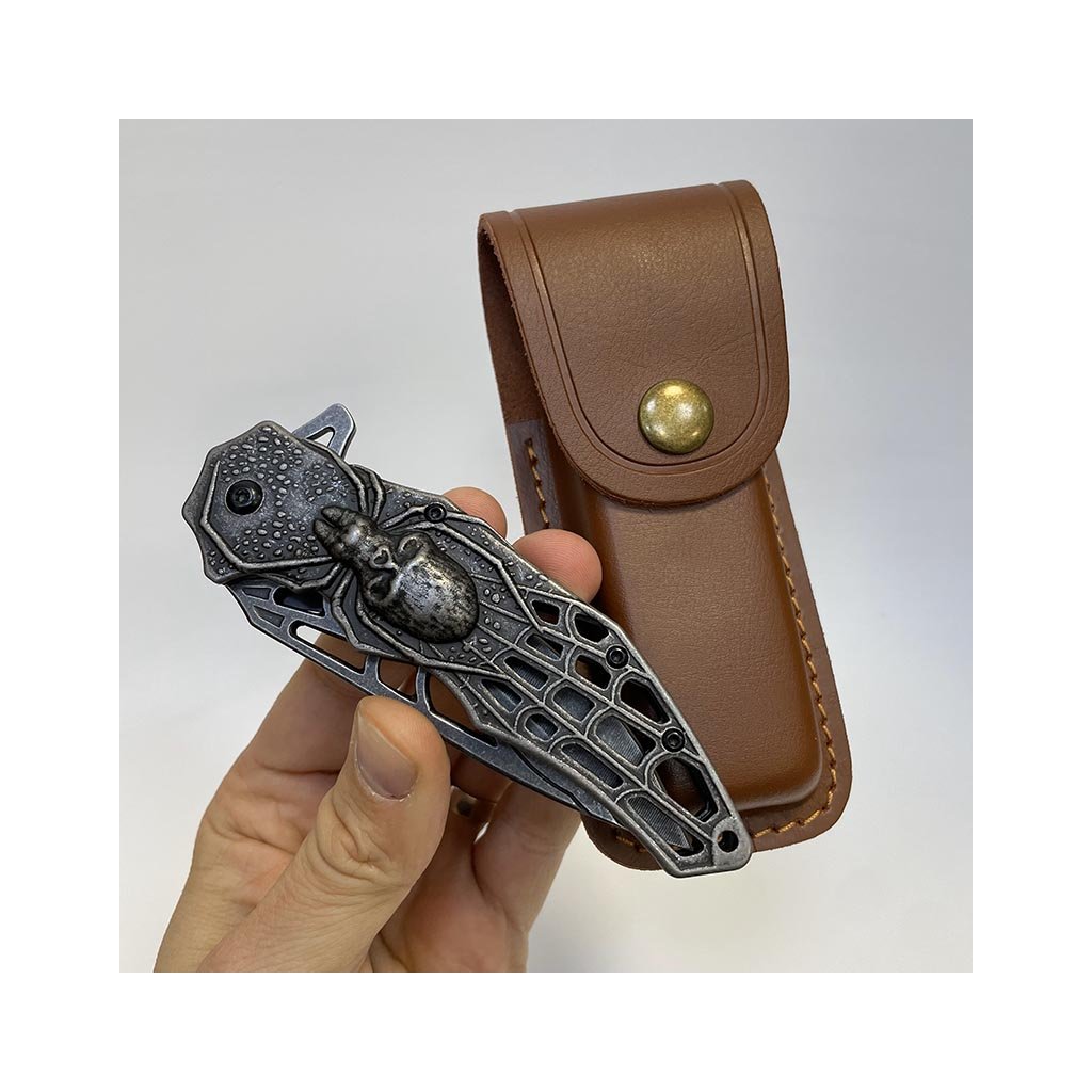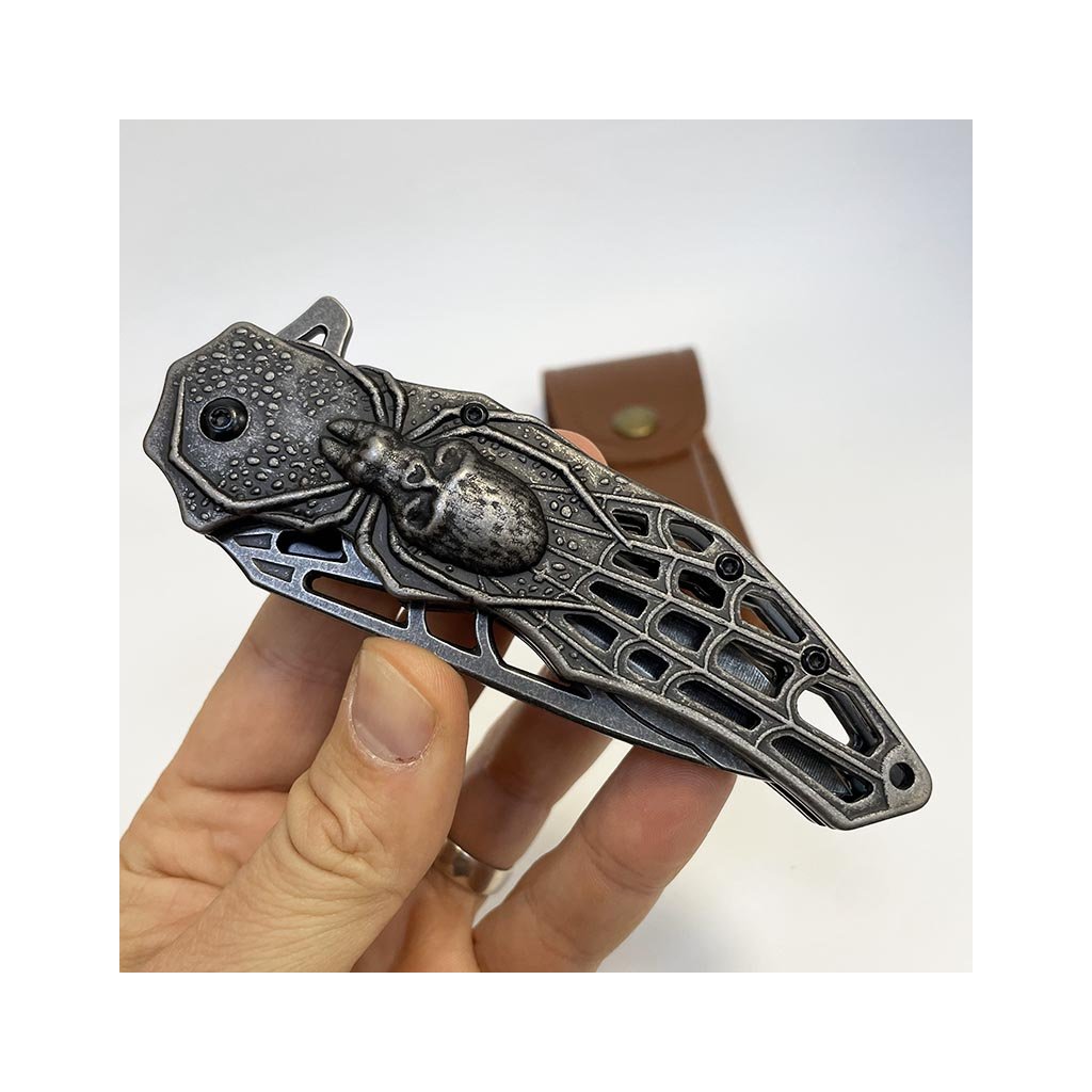 Nádherný kousek, extra kvalitní kovový vyklápěcí nůž s nádhernou reliéfní strukturou pavouka na rukojeti. Navíc včetně koženého pouzdra, na které lze vyhotovit jedinečný a originální motiv, text, monogram.