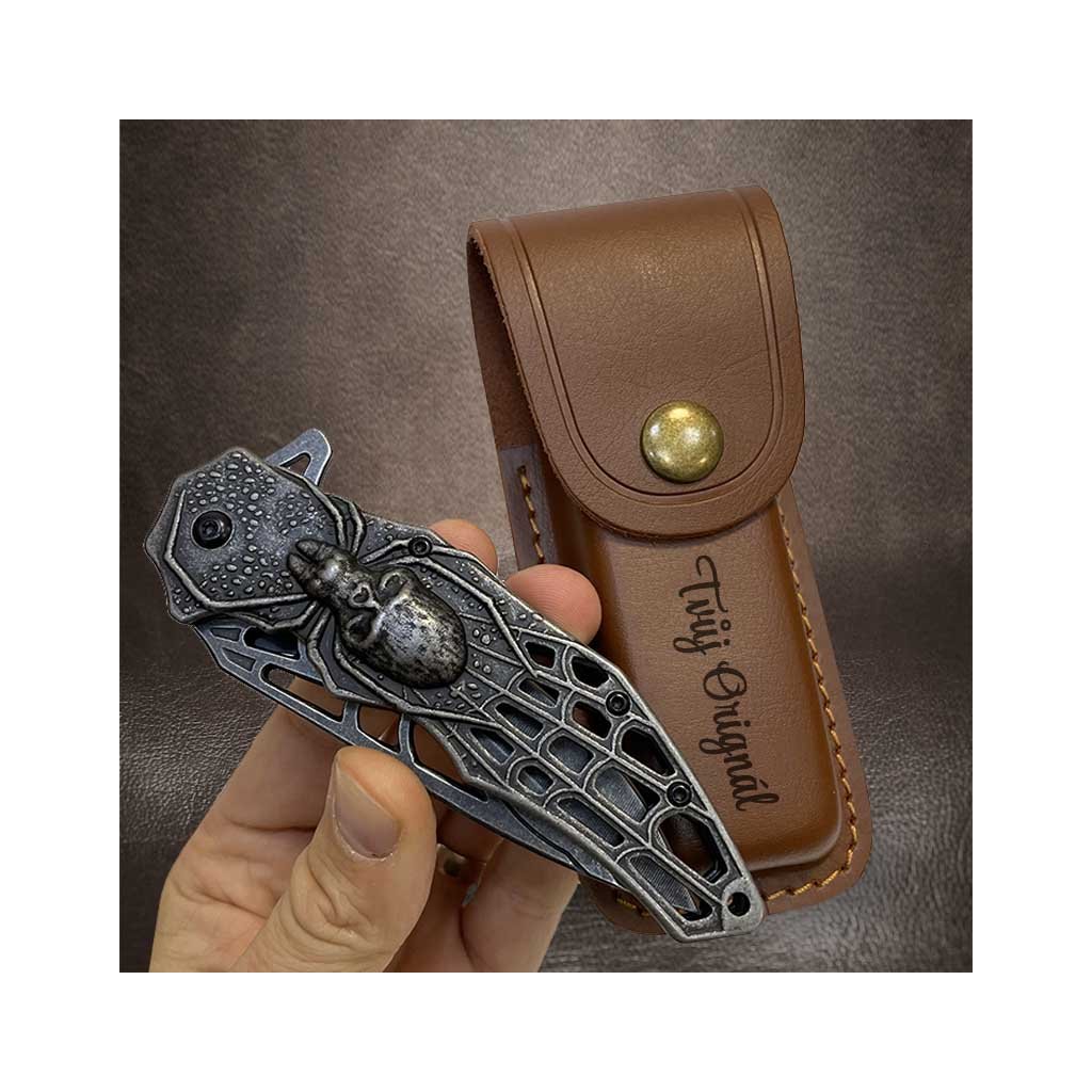 Prémiový reliéfní vyklápěcí nůž SPIDER s možností koženého pouzdra s vlastním textem + prémiové dárkové balení BE Original