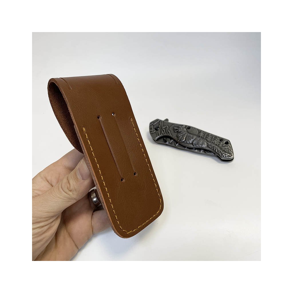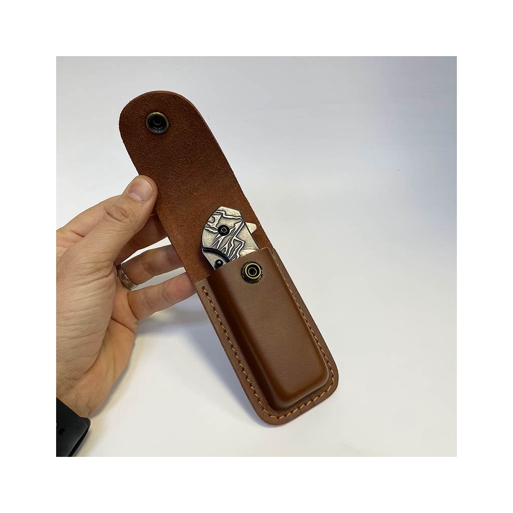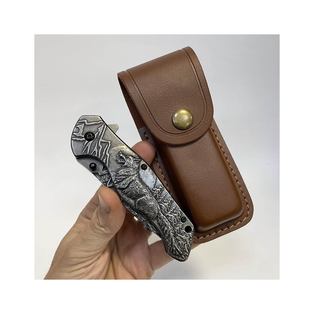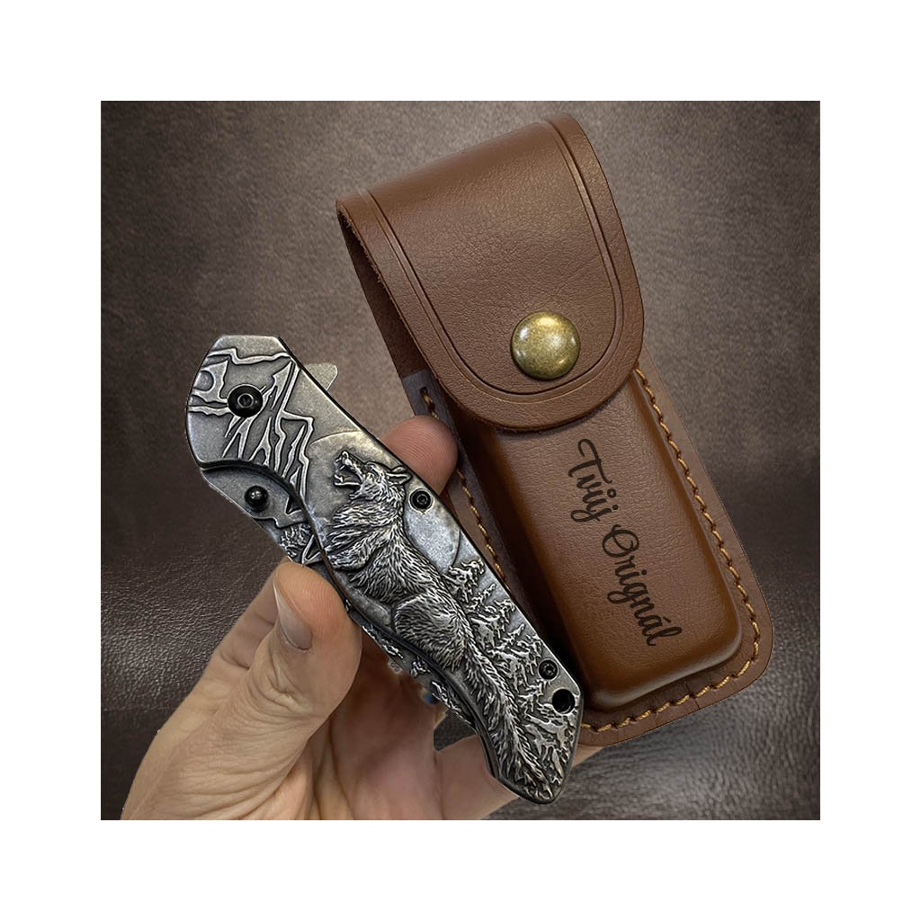 Luxusní vyklápěcí nůž s detailním reliéfem vlka a kvalitním koženým pouzdrem. Vlastní text, monogram či motiv na pouzdře z něj udělají originální dárek nebo osobní talisman.