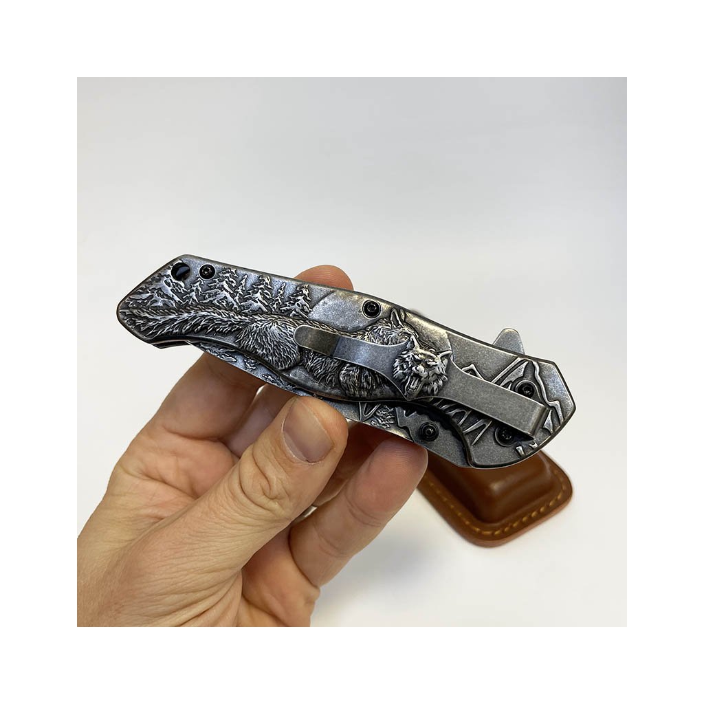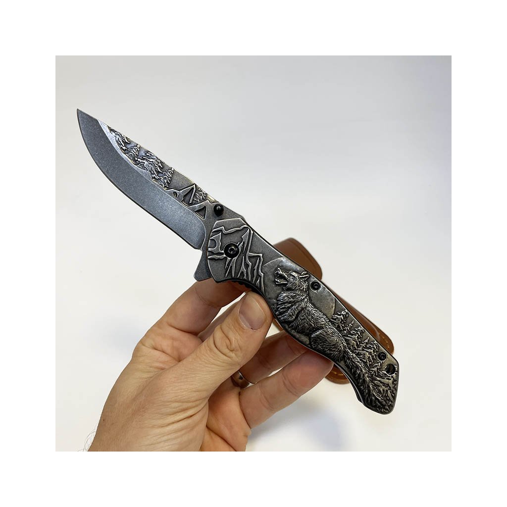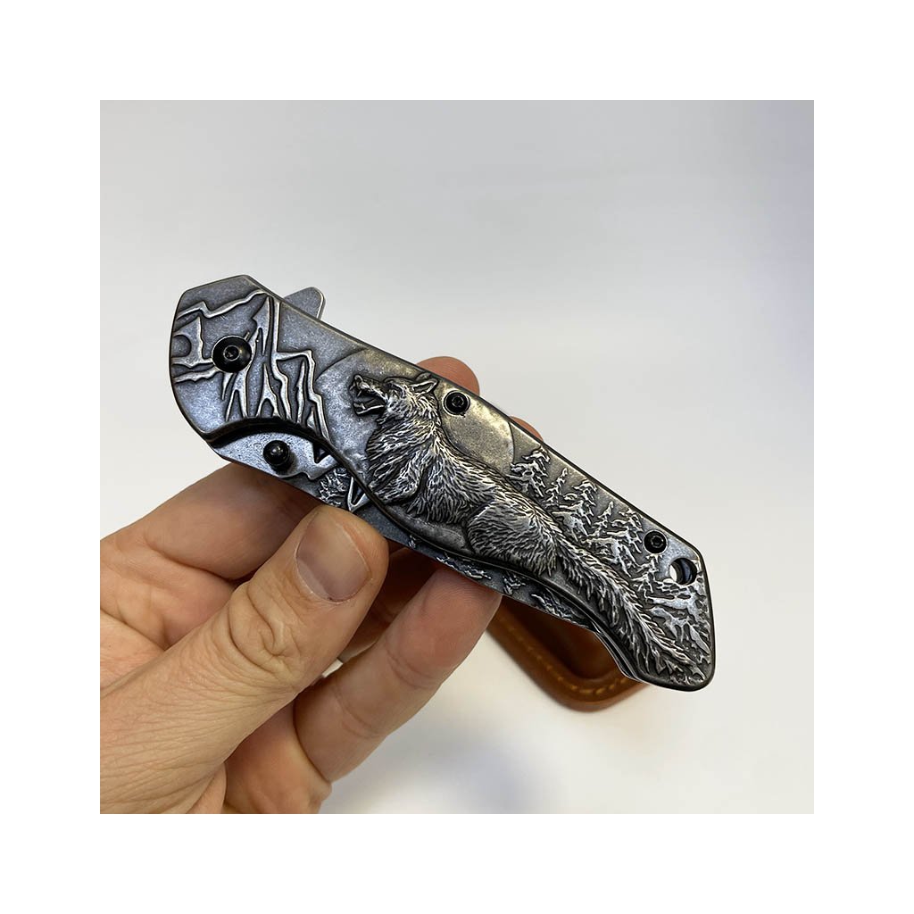Nádherný kousek, extra kvalitní kovový vyklápěcí nůž s nádhernou reliéfní strukturou vlka na rukojeti. Navíc včetně koženého pouzdra, na které lze vyhotovit jedinečný a originální motiv, text, monogram.