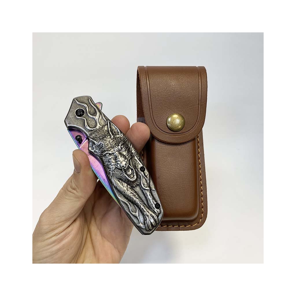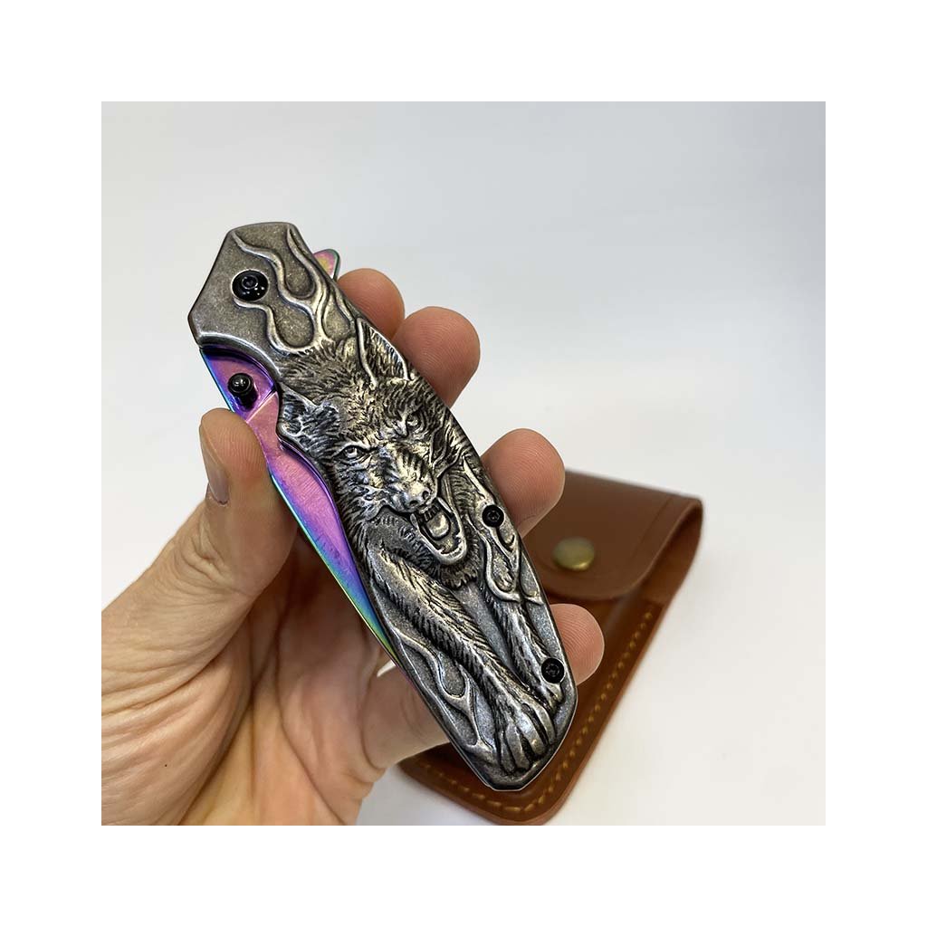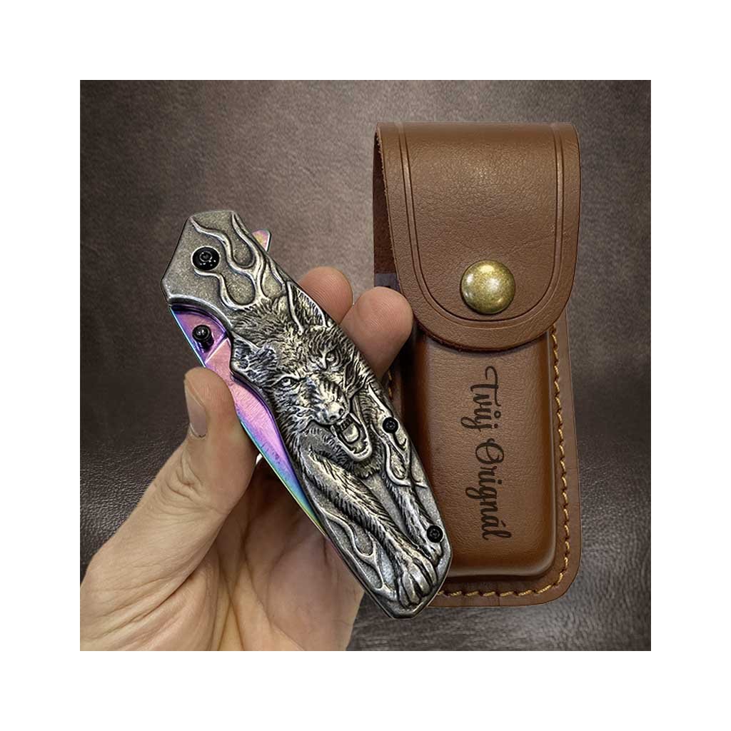 Nádherný kousek, extra kvalitní kovový vyklápěcí nůž s nádhernou reliéfní strukturou vlka na rukojeti. Navíc včetně koženého pouzdra, na které lze vyhotovit jedinečný a originální motiv, text, monogram.