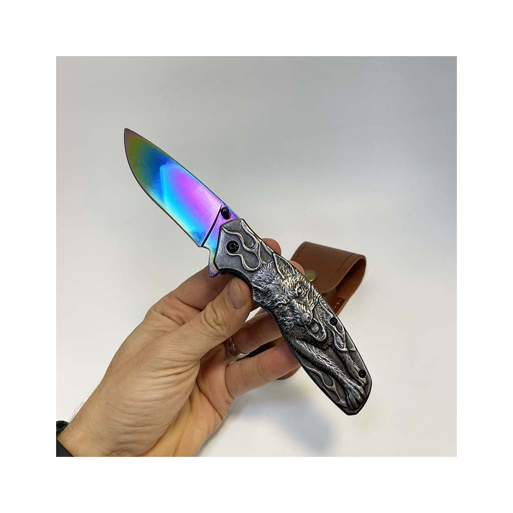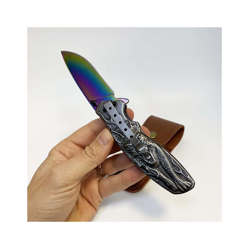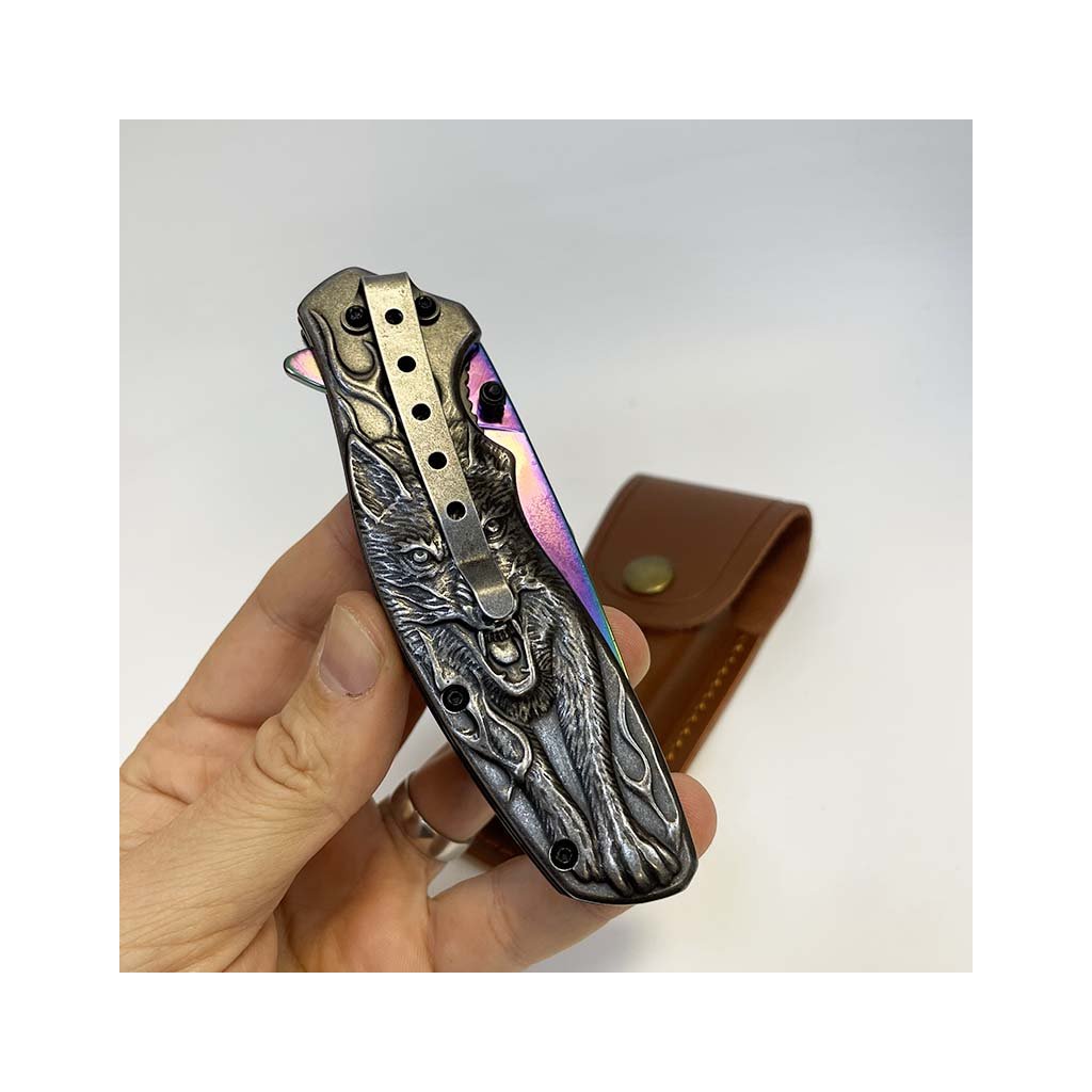 Nádherný kousek, extra kvalitní kovový vyklápěcí nůž s nádhernou reliéfní strukturou vlka na rukojeti. Navíc včetně koženého pouzdra, na které lze vyhotovit jedinečný a originální motiv, text, monogram.