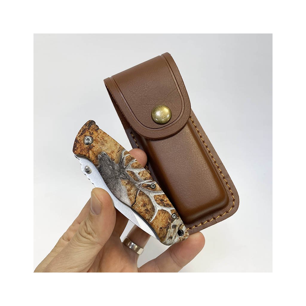 Luxusní prémiový vyklápěcí nůž malba JELEN včetně koženého pouzdra, navíc monogram, text, motiv