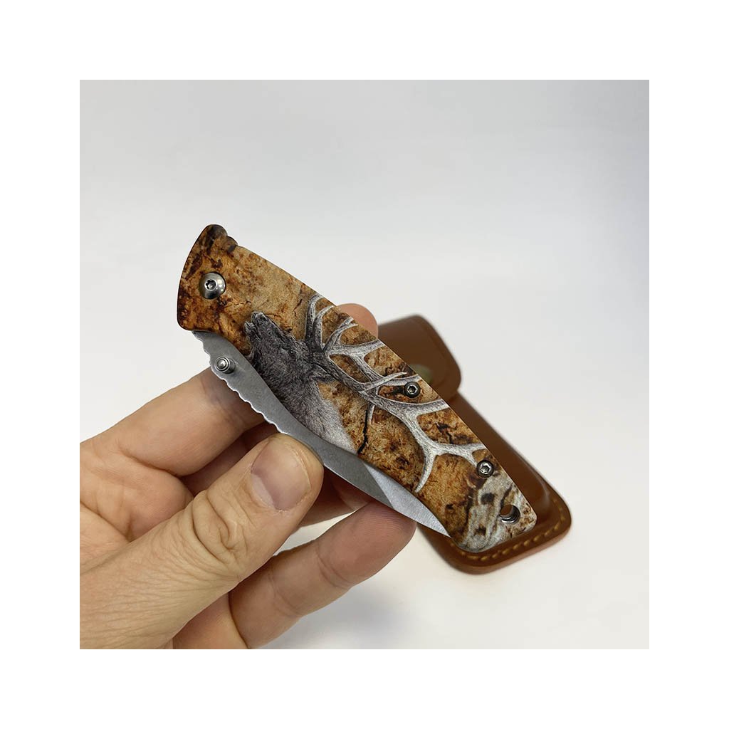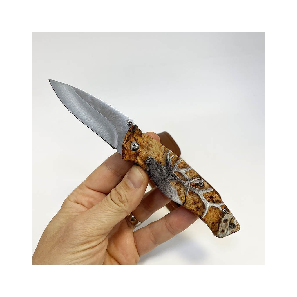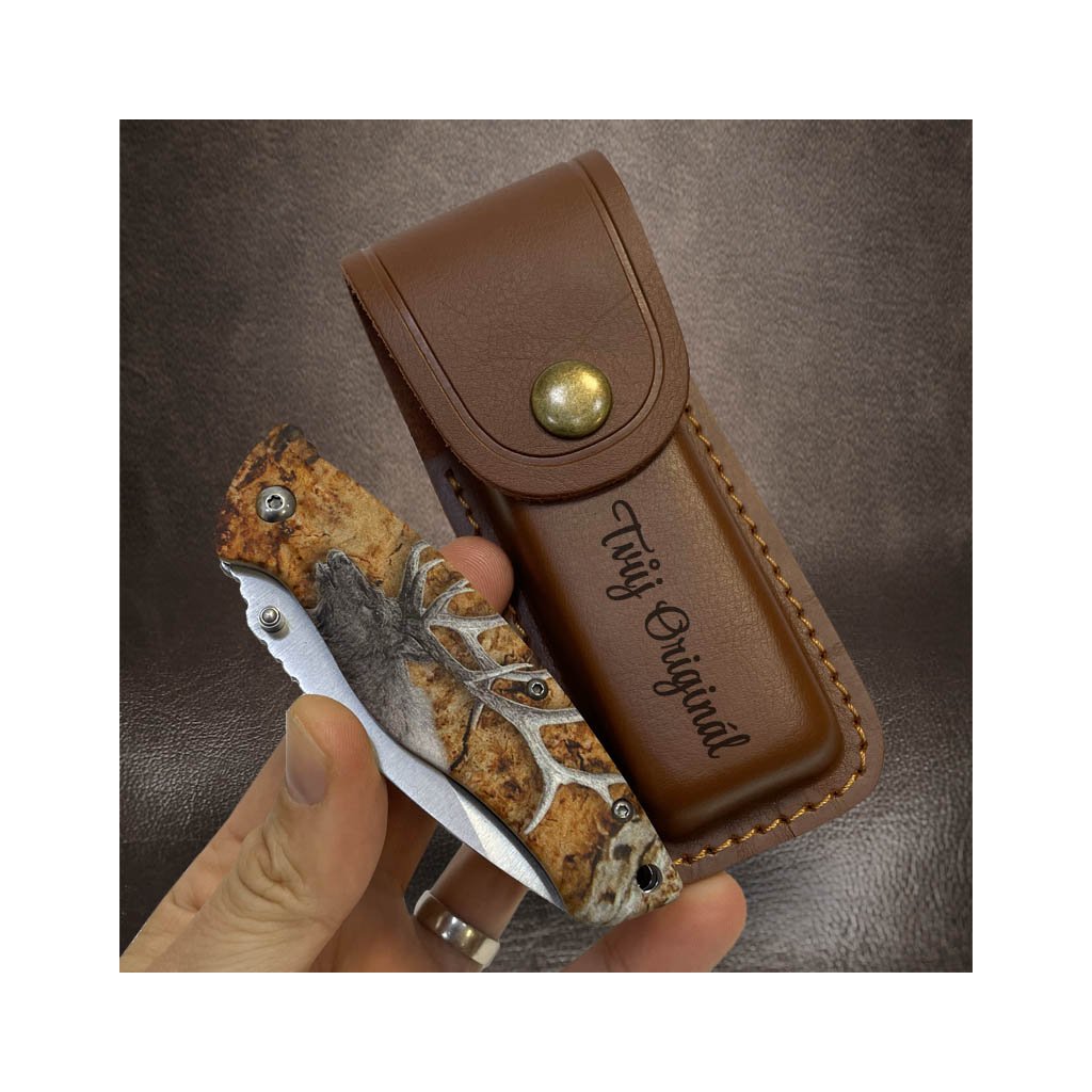 Prémiový vyklápěcí nůž malba JELEN s možností koženého pouzdra s vlastním textem + prémiové dárkové balení BE Original