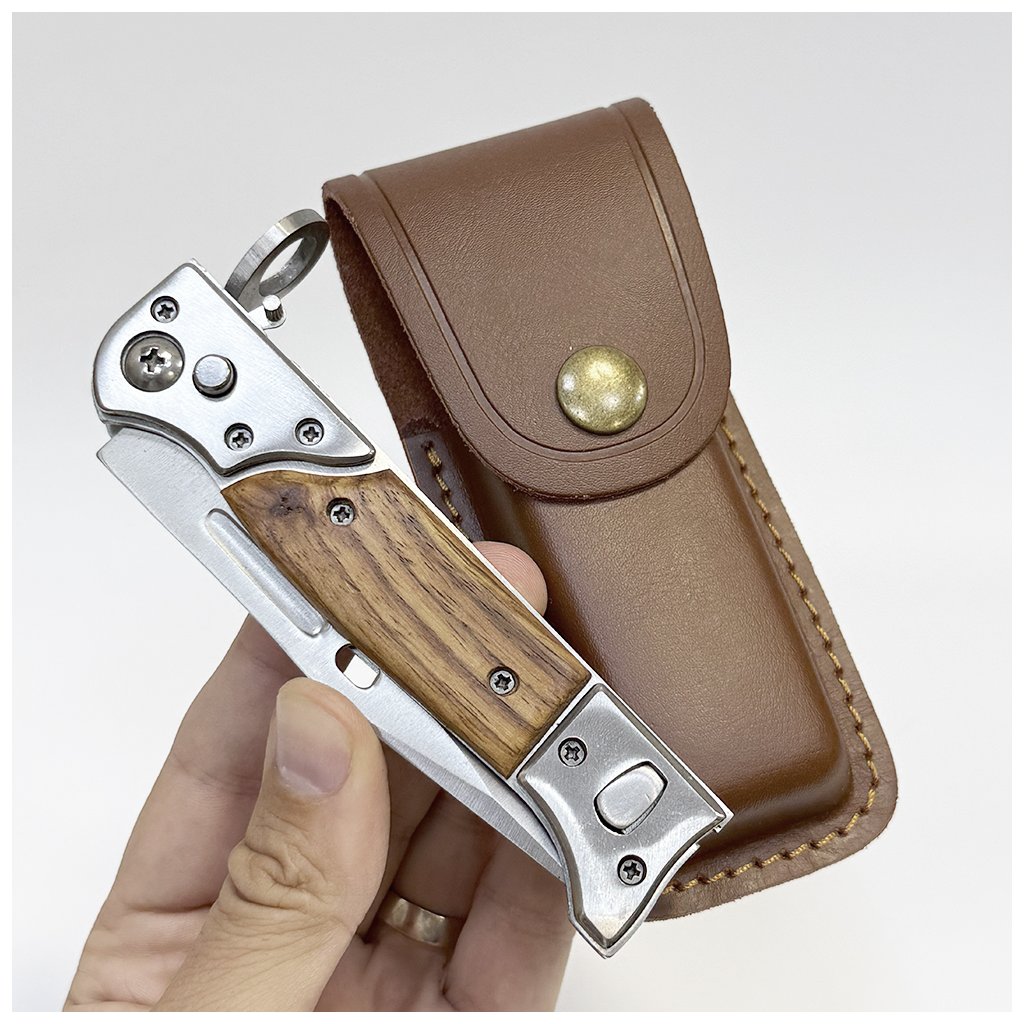 Kvalitní vyklápěcí nůž s dřevěnou rukojetí a koženým pouzdrem. Včetně gravírování vlastního textu – ideální jako osobní dárek pro každého muže.
