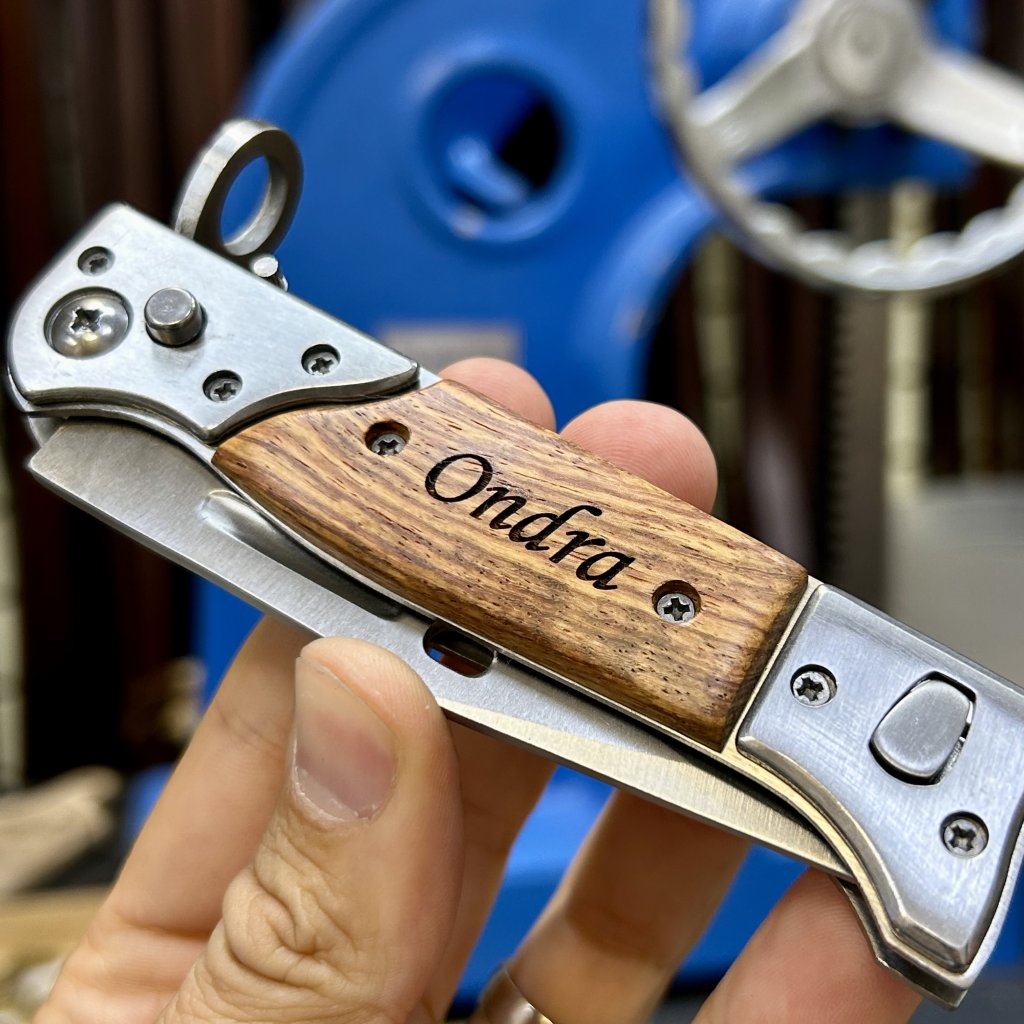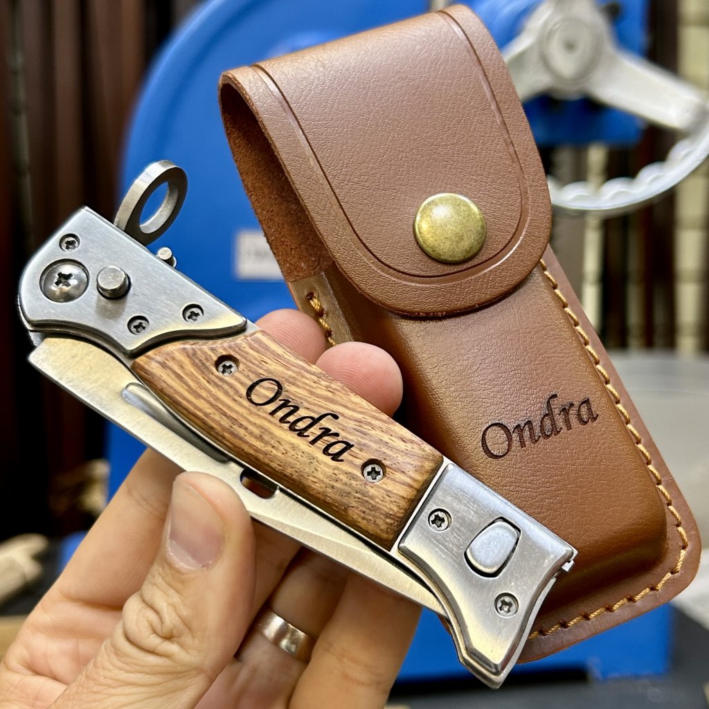 Prémiový vyklápěcí nůž s možností vlastního textu nebo monogramu na dřevěnou rukojeť. Spojení kvality, praktičnosti a originality – ideální jako osobní dárek nebo stylový doplněk