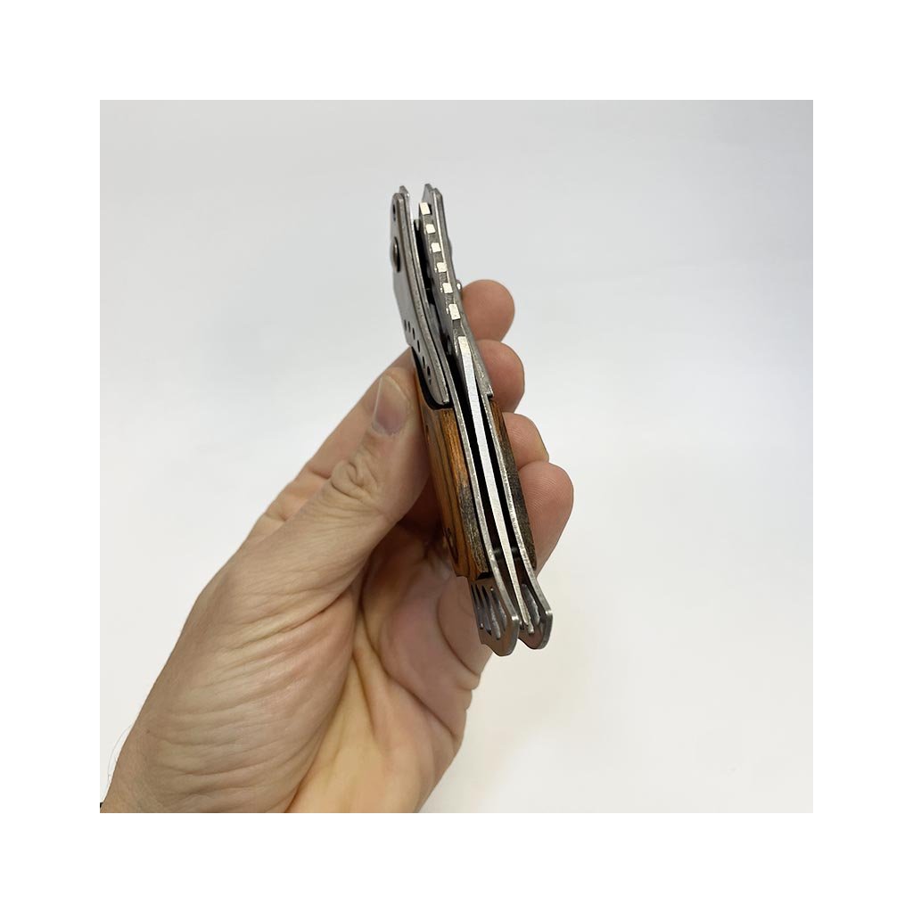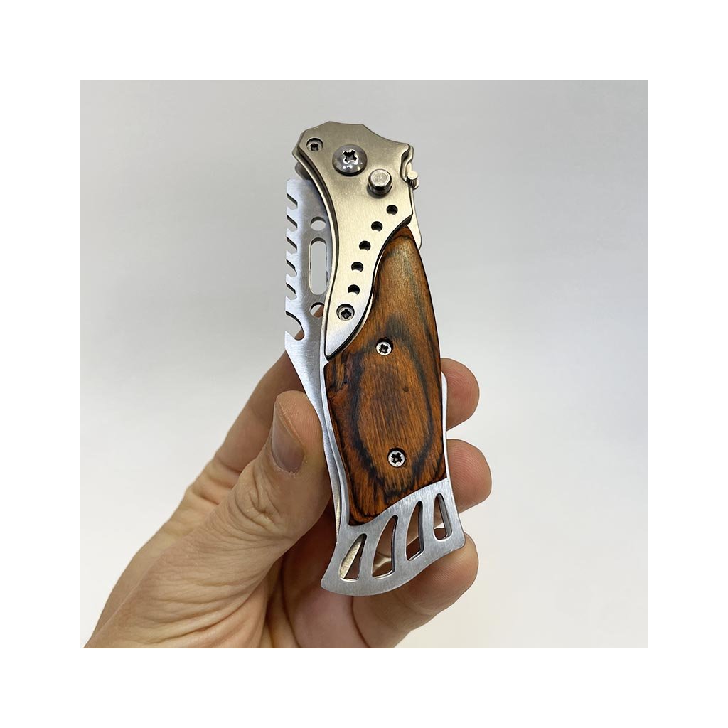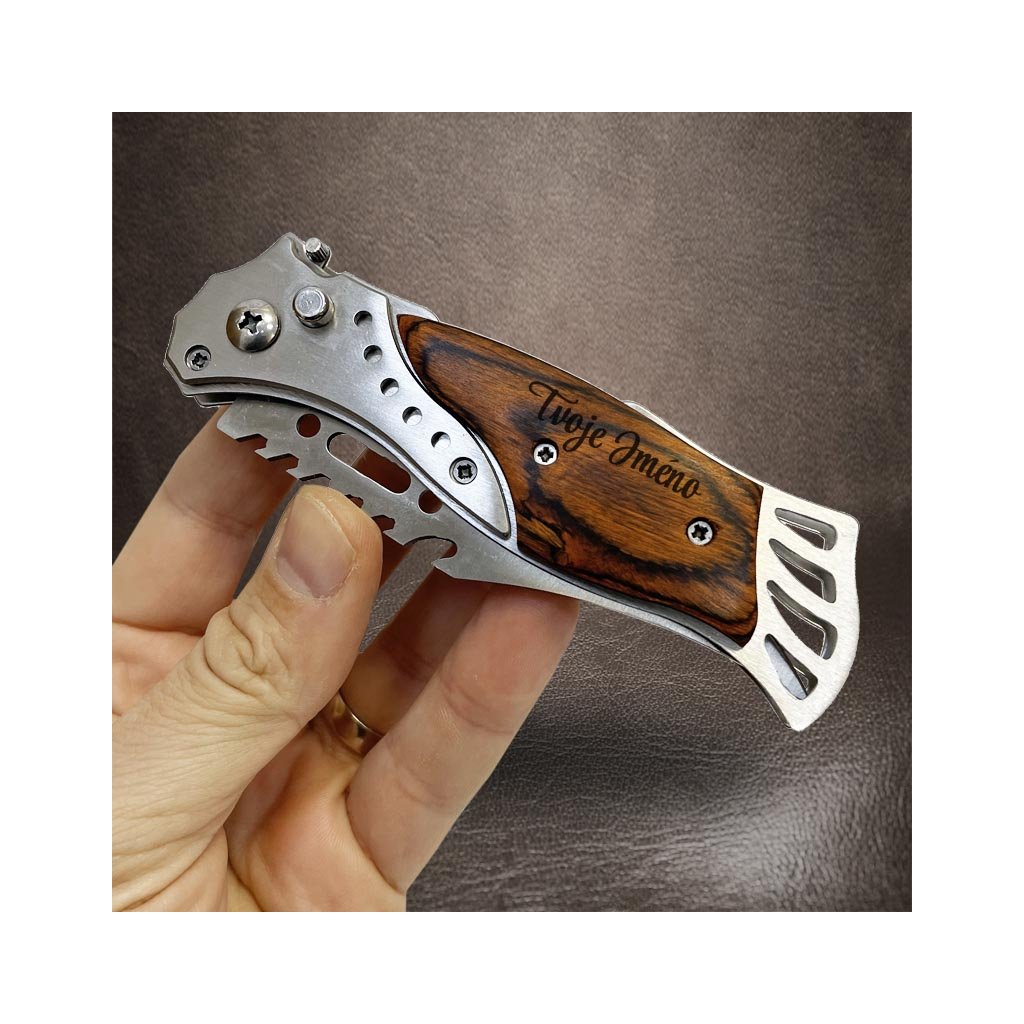 Stylový kvalitní vyklápěcí nůž s dřevěnou rukojetí a možností gravírování vlastního textu. K noži lze dokoupit kožené pouzdro s personalizací – ideální dárek na míru.