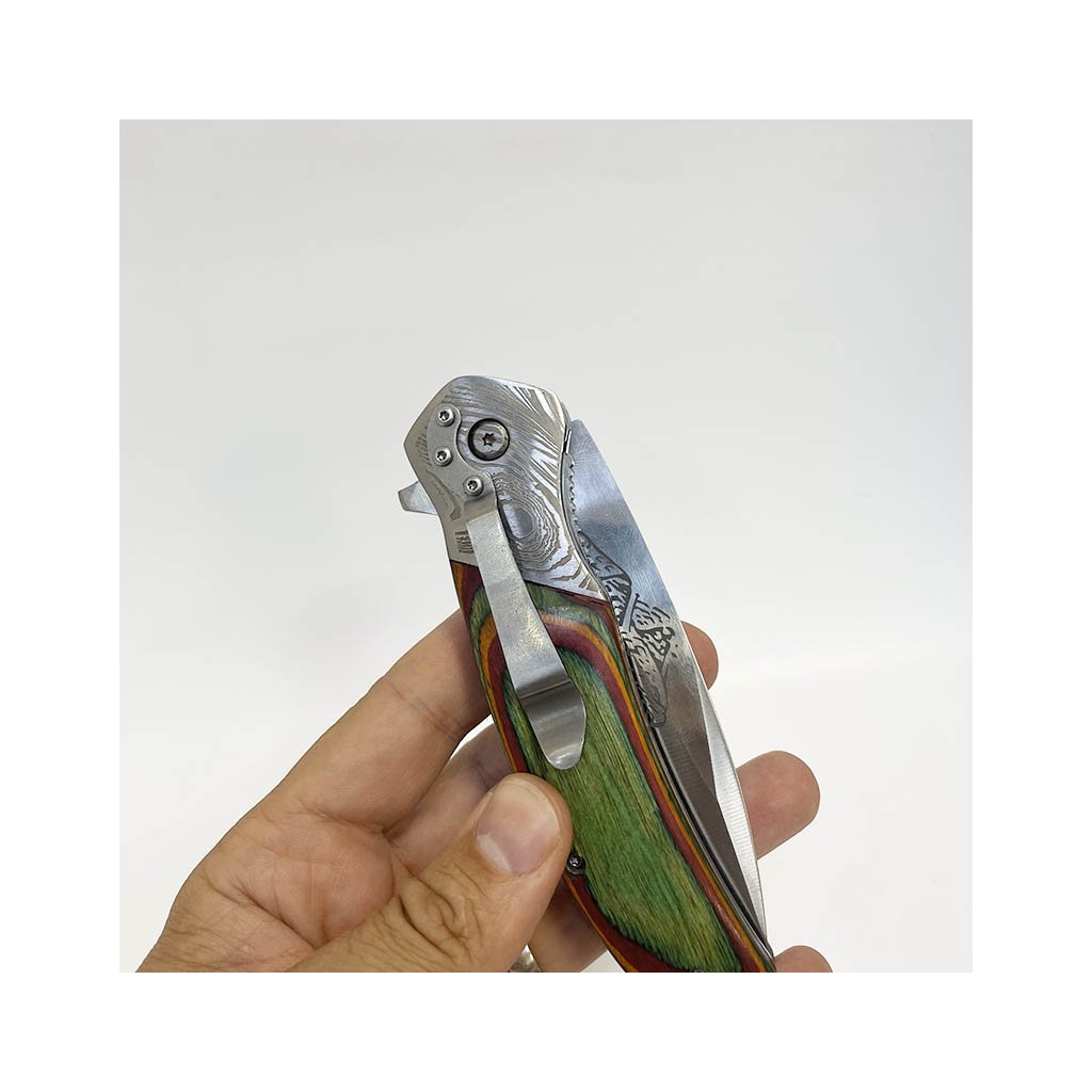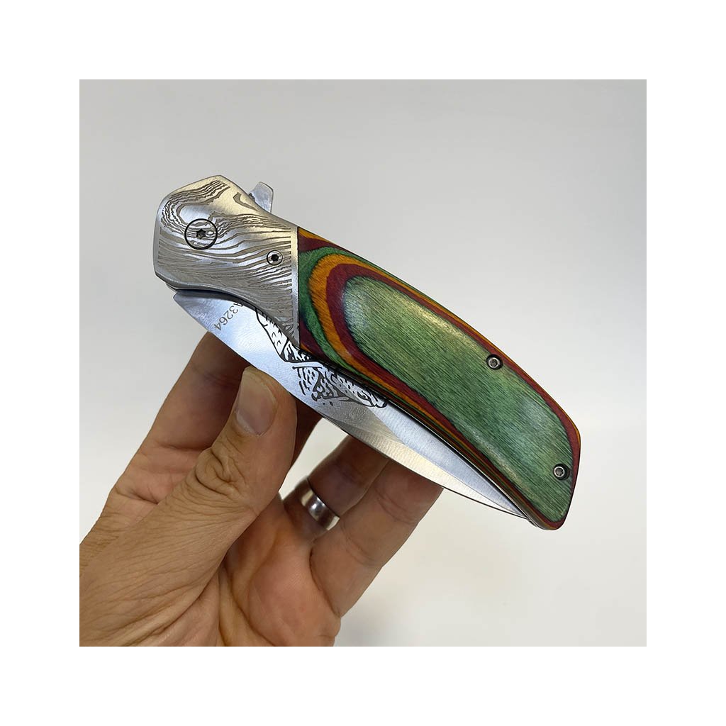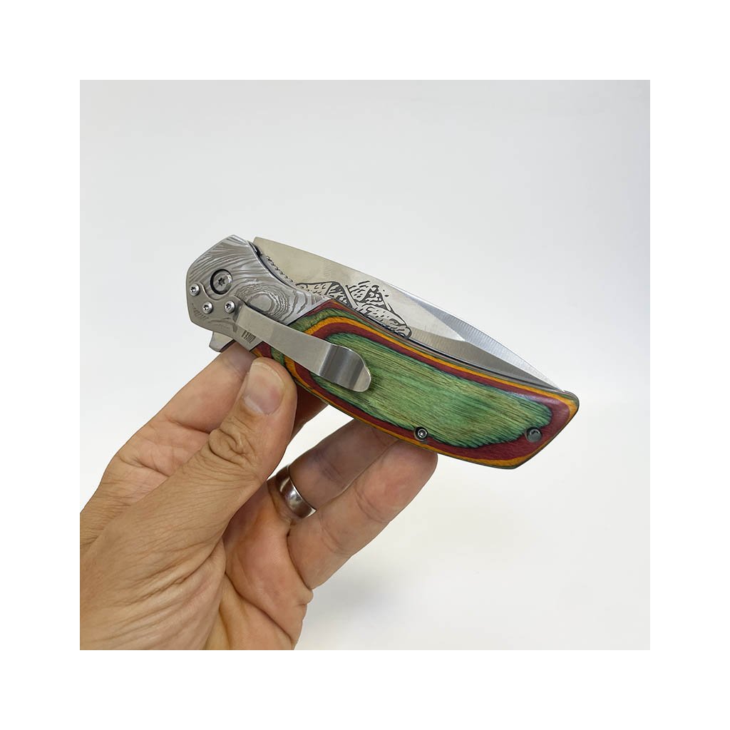Robustní vyklápěcí nůž s dřevěnou rukojetí, gravírováním a koženým pouzdrem. Vhodné jako originální dárek s vlastním věnováním. Prémiová kvalita.