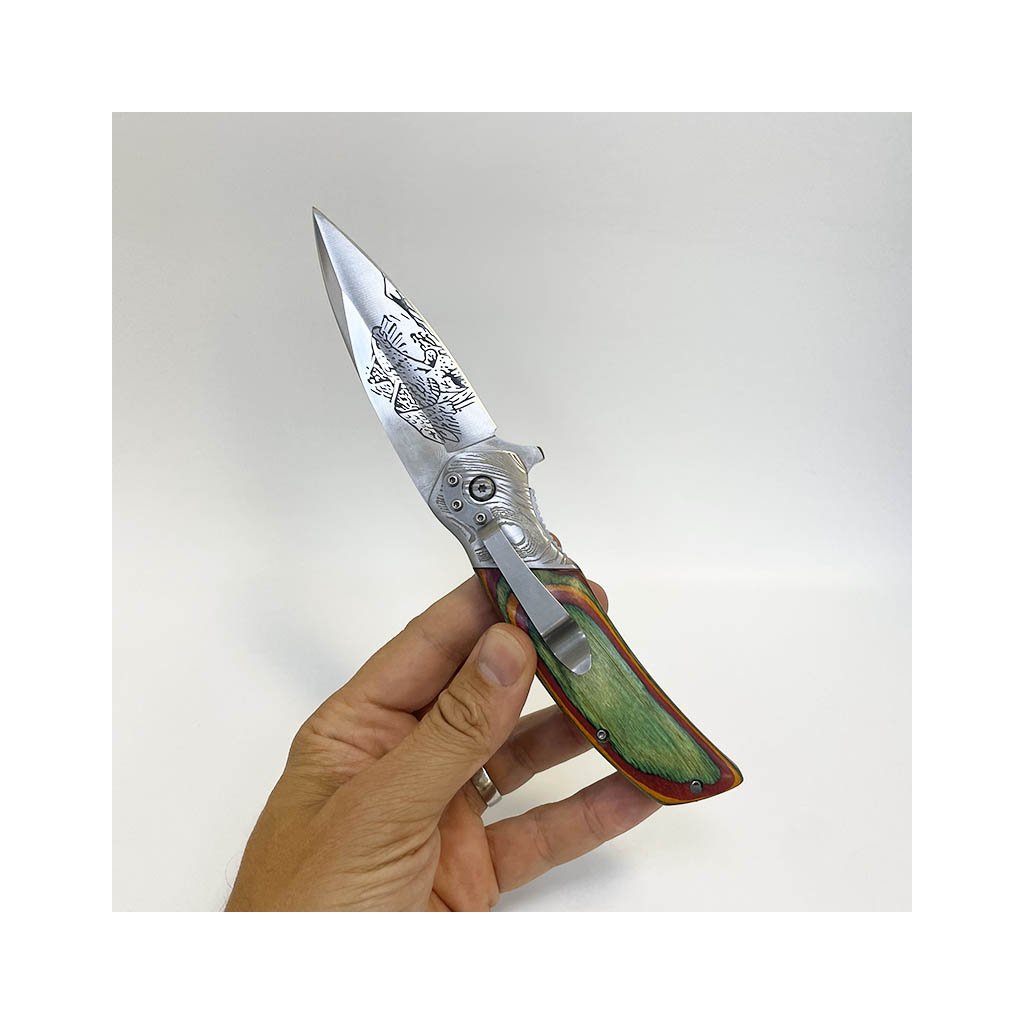 Kvalitní vyklápěcí nůž s kresbou na čepeli a vlastním textem
