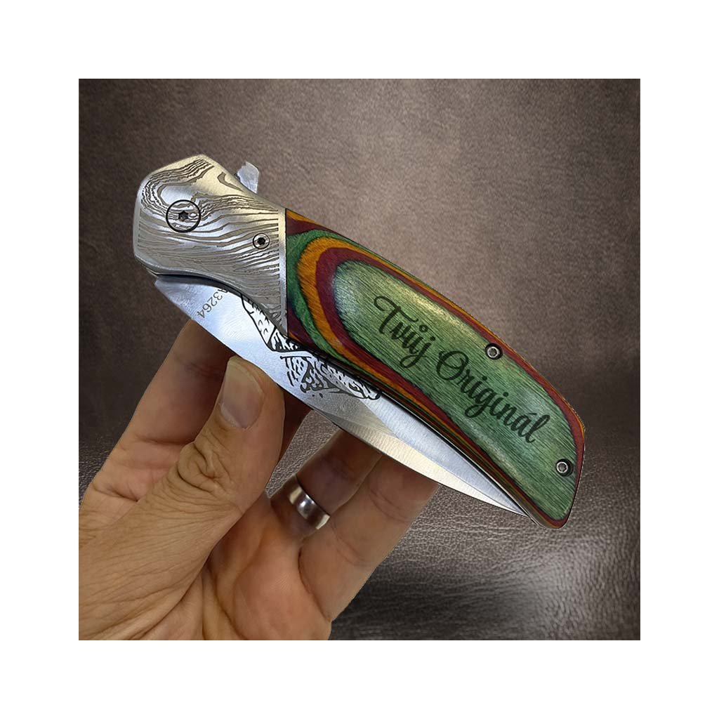 Prémiový vyklápěcí nůž s možností vlastního textu nebo monogramu na dřevěnou rukojeť. Spojení kvality, praktičnosti a originality – ideální jako osobní dárek nebo stylový doplněk