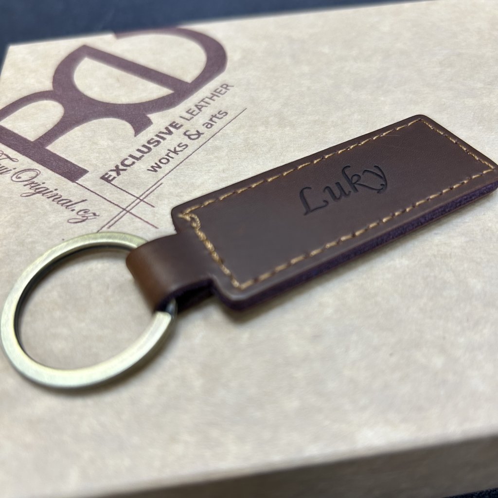 Hnědá kožená klíčenka s možností monogramu, textu či symbolu. Ručně vyrobený doplněk, který spojuje praktičnost, eleganci a osobní charakter.